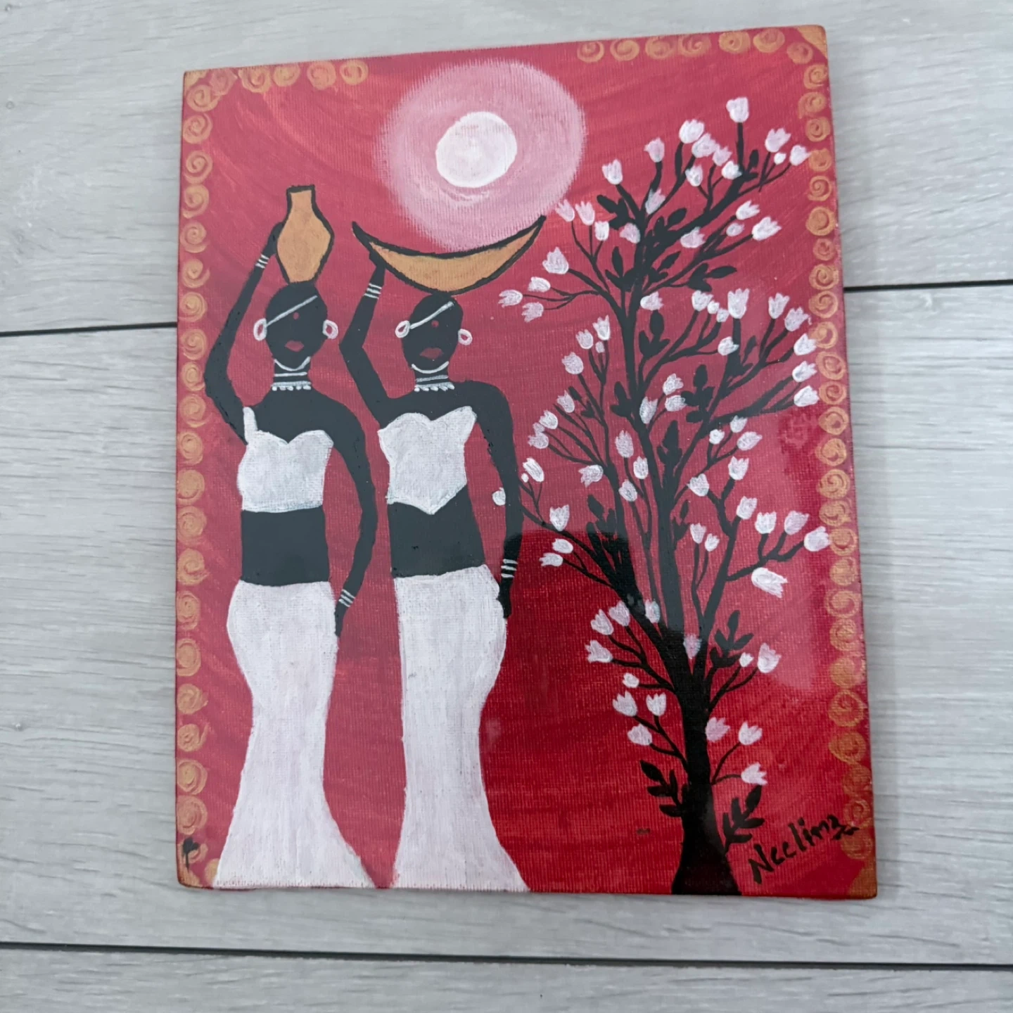 A unique painting featuring two women with a tree and moon on a red background. It's painted on a canvas board and ready to add a touch of culture to your home
