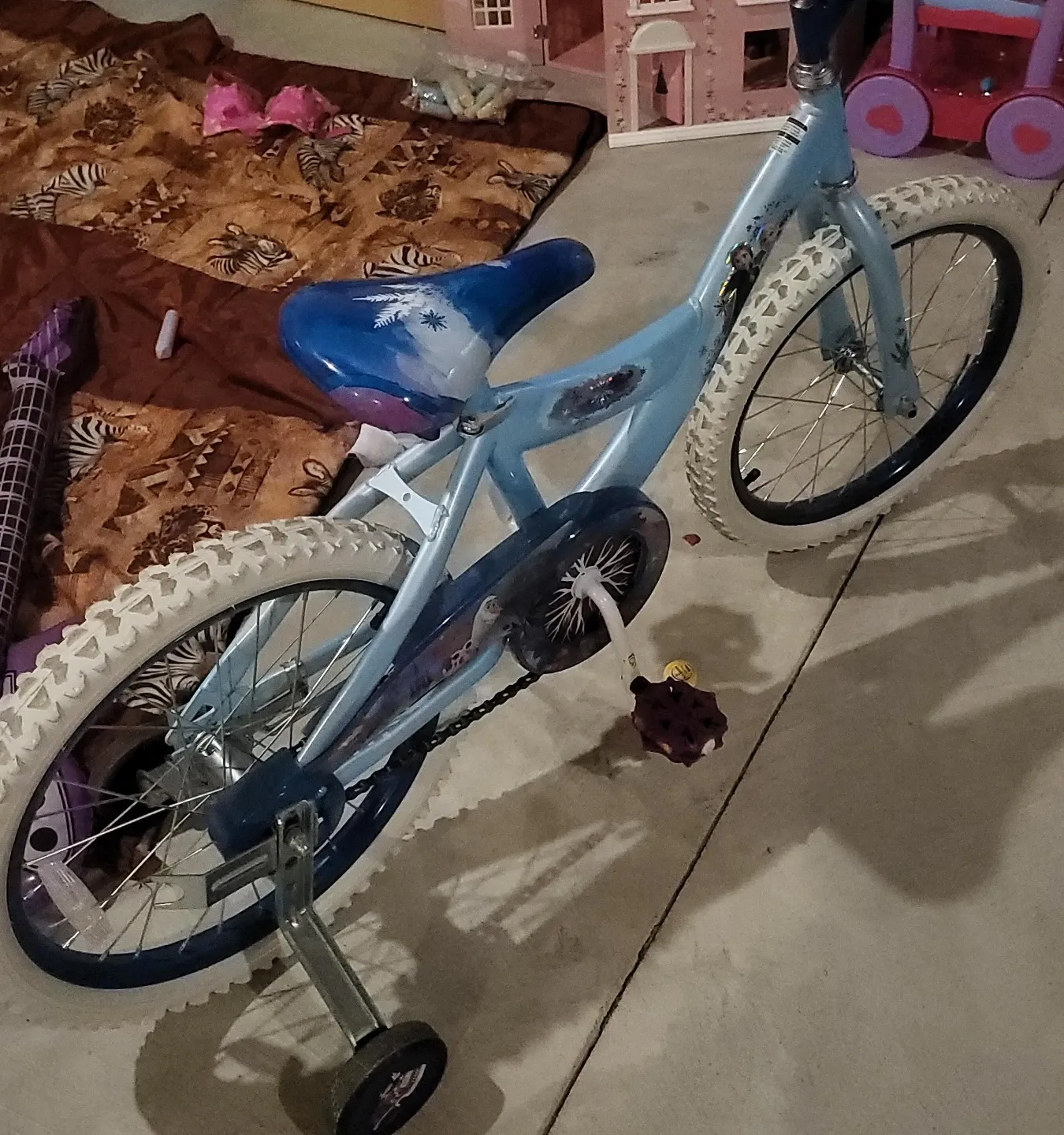 Here's a cute Disney Frozen themed kids bike! It's blue with graphics from the movie on the frame and seat. Perfect for a young child learning to ride!