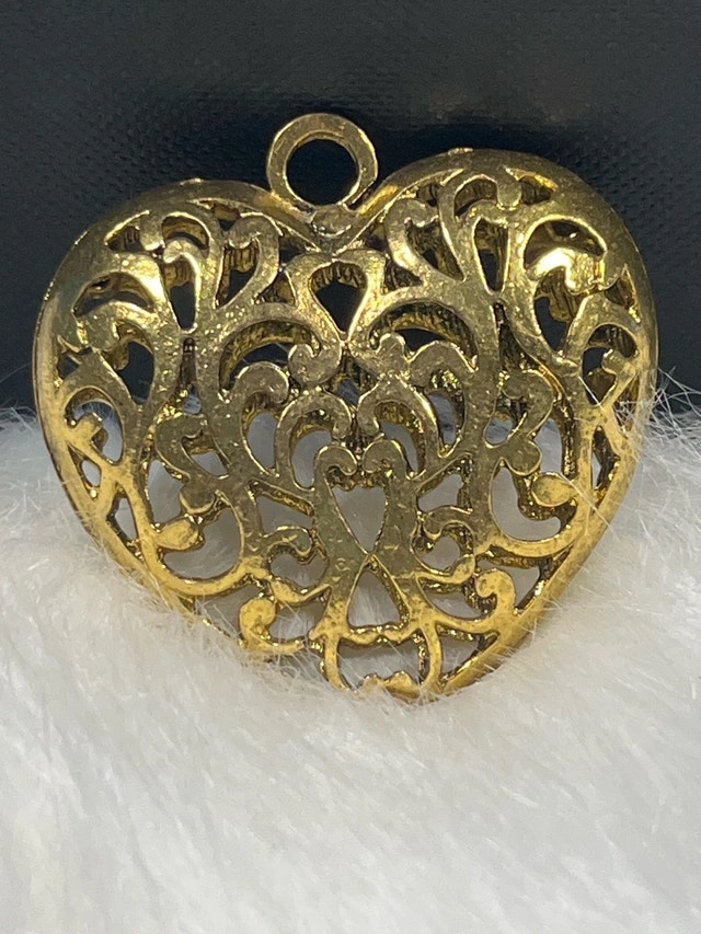 This is a charming heart pendant with an intricate filigree design, perfect for adding a touch of elegance to any necklace. This pendant has an antiqued gold finish for a vintage-inspired look. Being a used item, it carries a history and character that only time can impart.