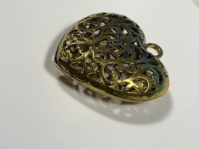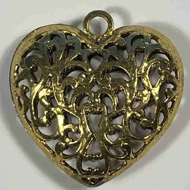 This is a charming heart pendant with an intricate filigree design, perfect for adding a touch of elegance to any necklace. This pendant has an antiqued gold finish for a vintage-inspired look. Being a used item, it carries a history and character that only time can impart.