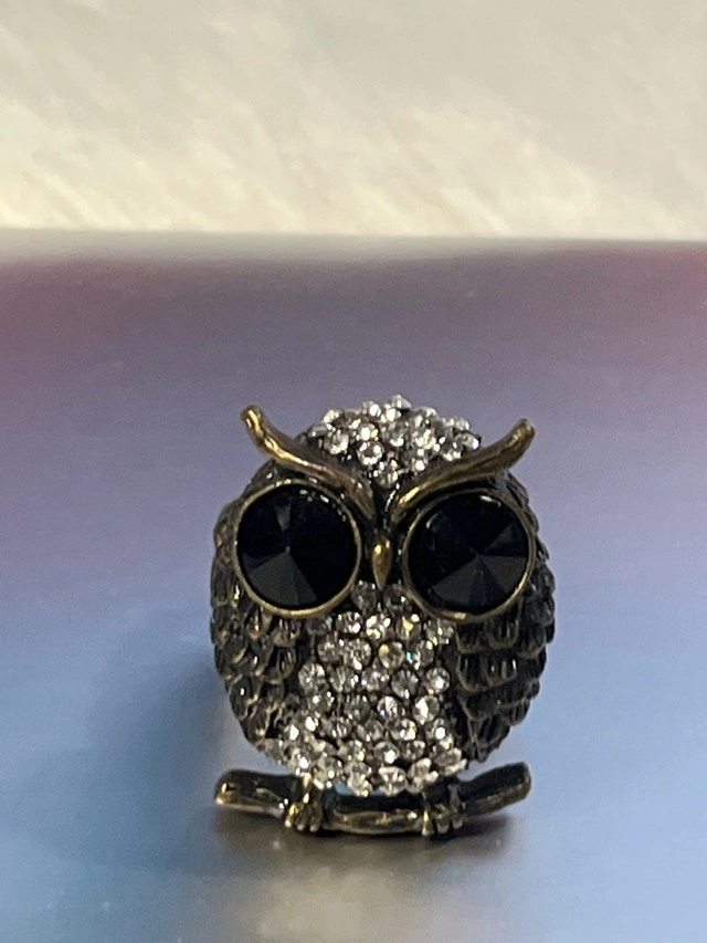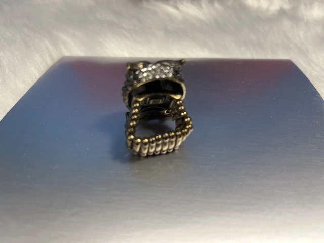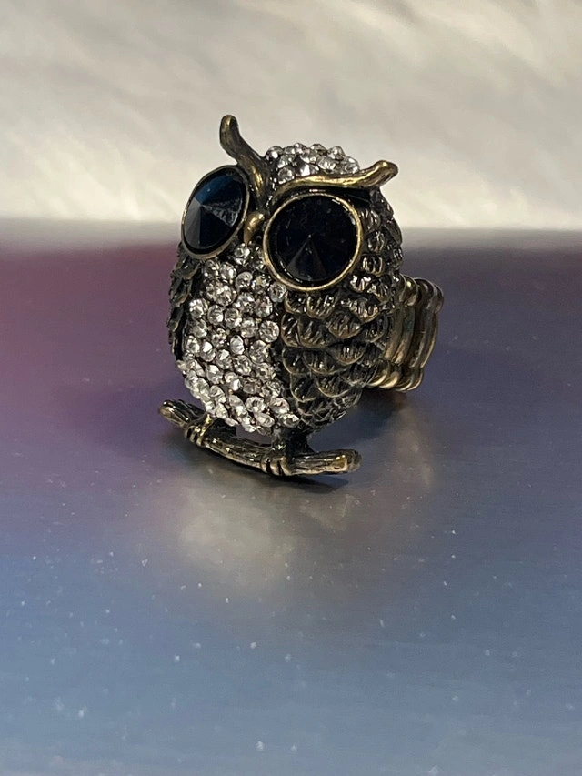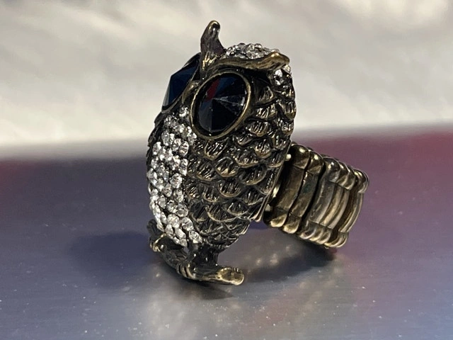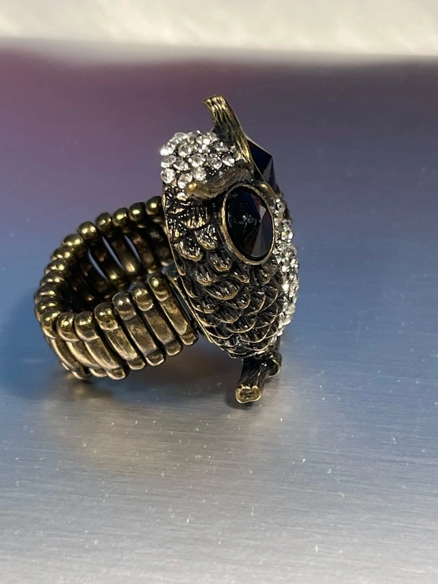 This is an owl ring with black stone eyes and embellished with clear gems. The band is expandable and it would be best suited for someone who wears a size 7-9 ring. It has been worn a few times but is in good condition. I hope this hoot of a ring finds its way to you, and if the ad is still up, then yes, it's still available!