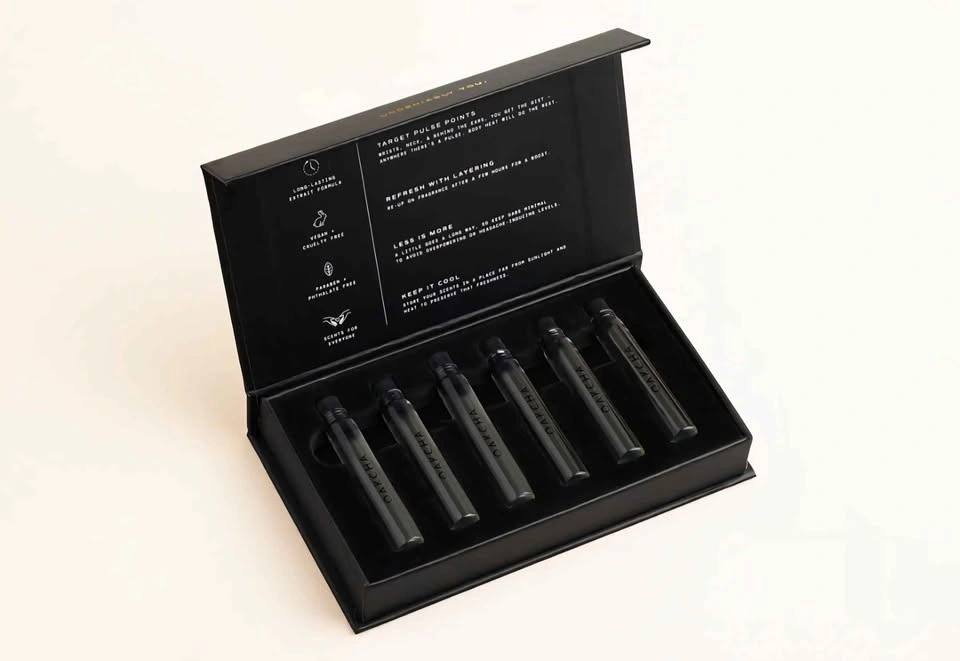 Oakcha’s Oud Sample Set featuring 6 extrait de parfum sprays (2 ml each) with a powerful 30–40% concentration for serious longevity and sillage.