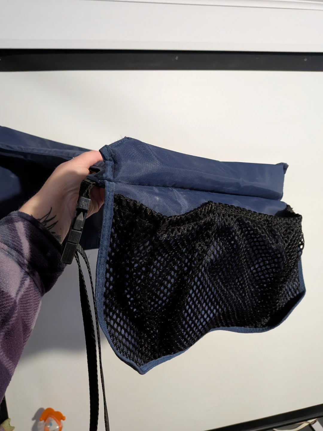 Here's a handy navy blue car seat organizer! It's perfect for keeping things tidy on the go. It features a mesh pocket and adjustable strap for easy use and wioable tray for snacking on the go.