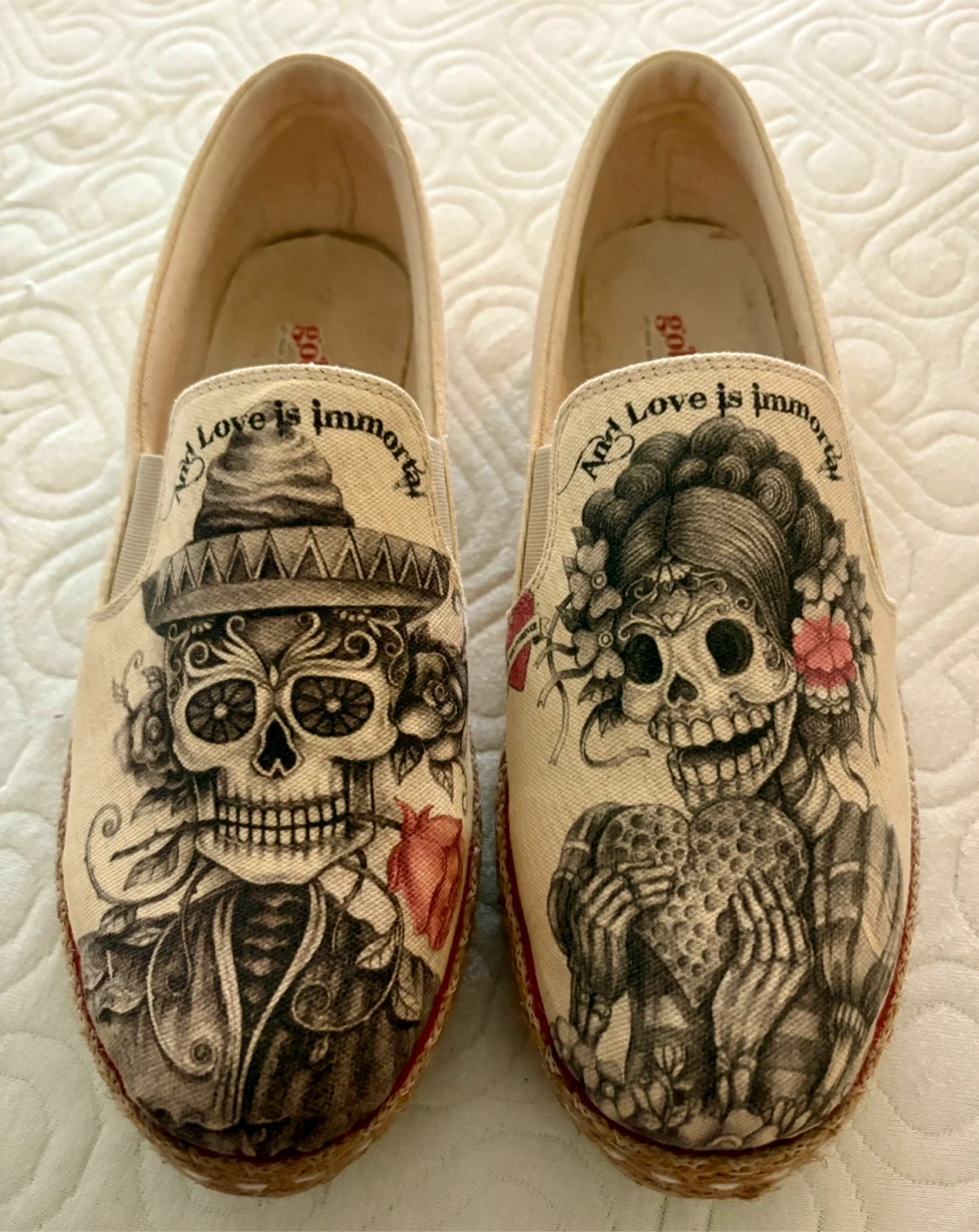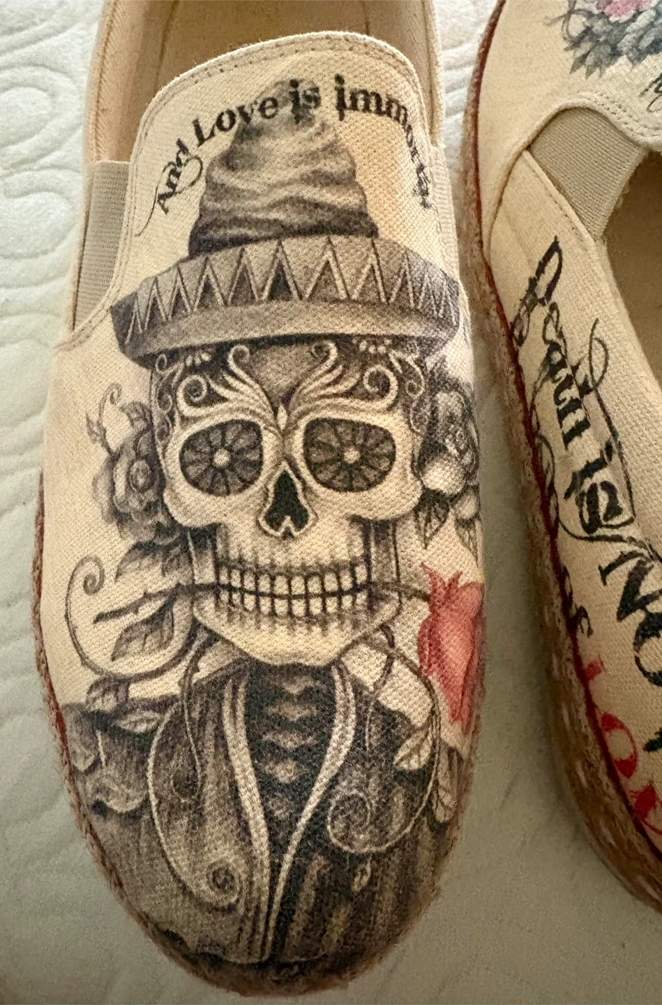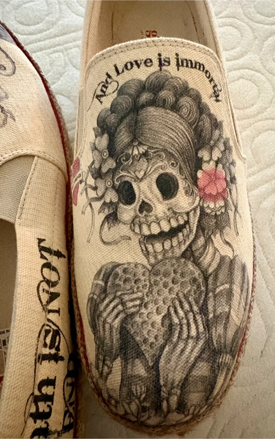 Unique slip-on shoes featuring skull and roses designs with text 'Forever Love' and 'Death is not the end of love'. These shoes have a woven jute trim and are in great condition!