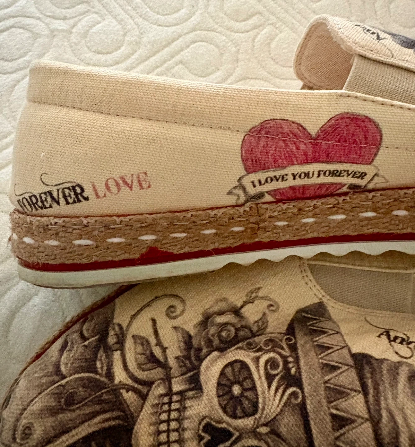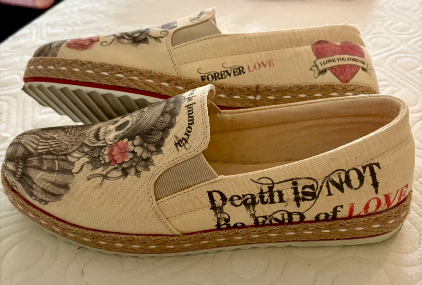 Unique slip-on shoes featuring skull and roses designs with text 'Forever Love' and 'Death is not the end of love'. These shoes have a woven jute trim and are in great condition!