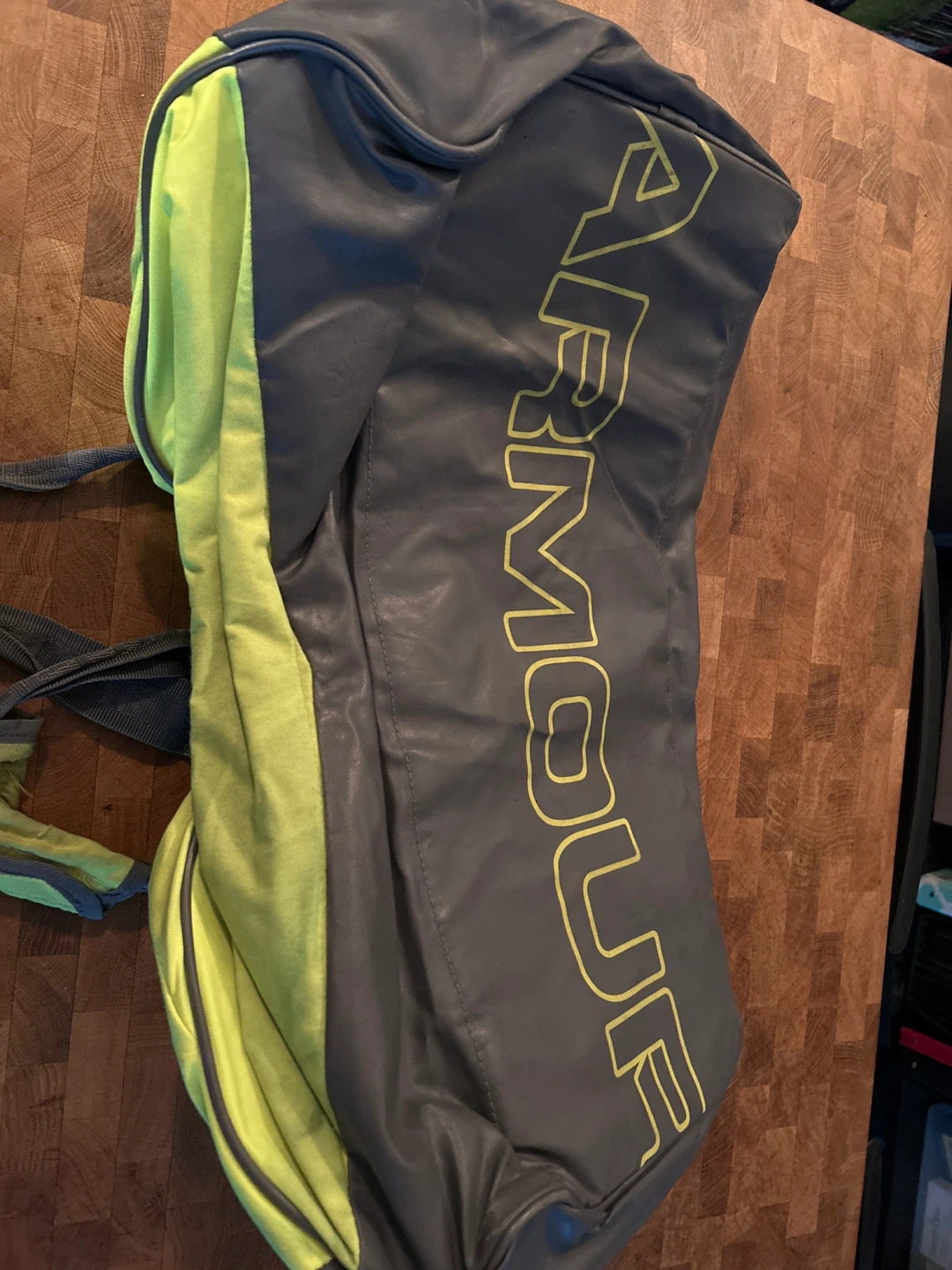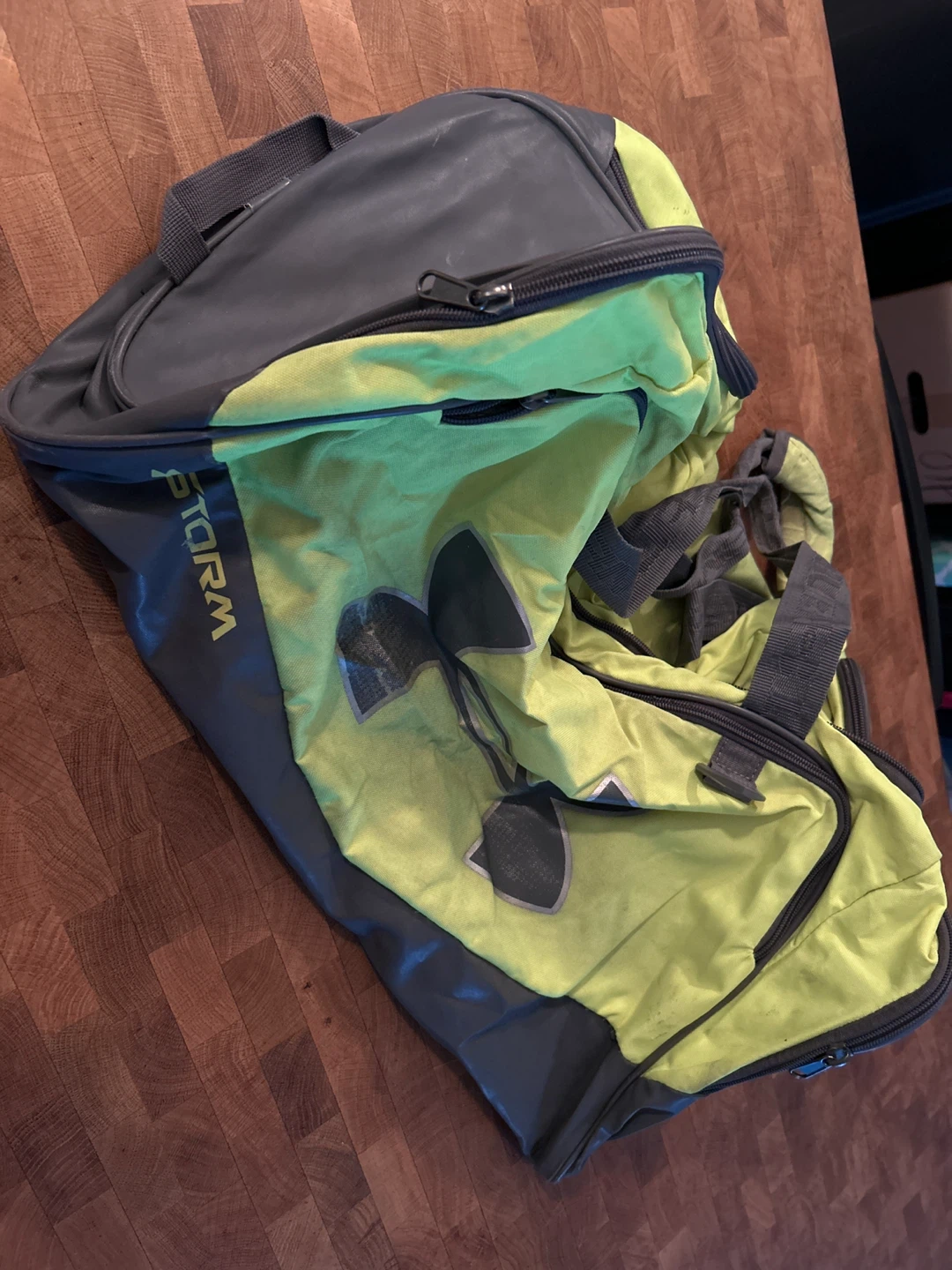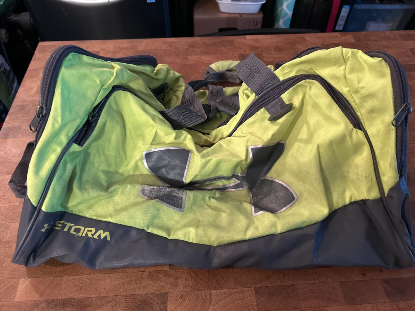 Selling a gently used Under Armour Storm duffle bag! It's a great size for the gym or weekend trips. The colours are a vibrant green and grey. It has the Under Armour logo on the side and 'STORM' printed on the front.