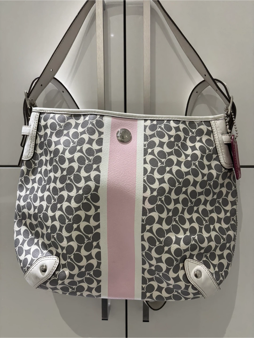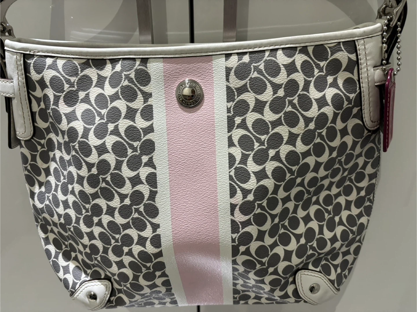 Coach hobo bag in grey and white and pink colour with signature pattern.