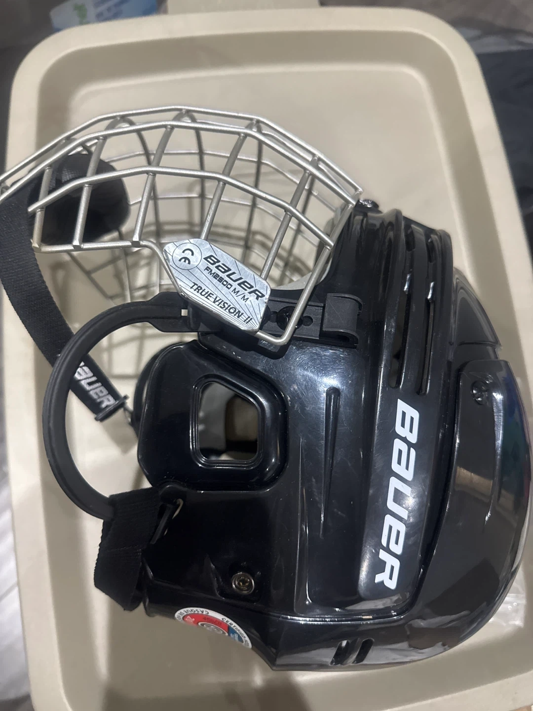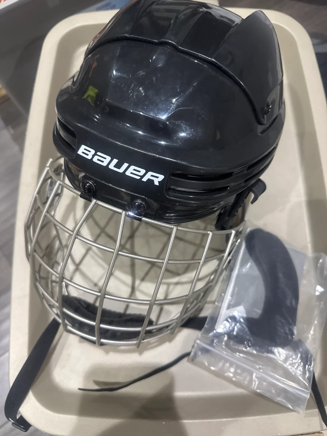 Bauer hockey helmet in great shape! It's a size M/M and comes with a cage. Perfect for hitting the ice! Check certification and condition in the pics