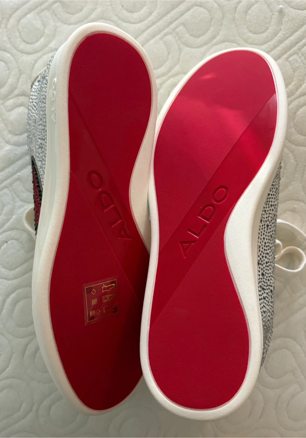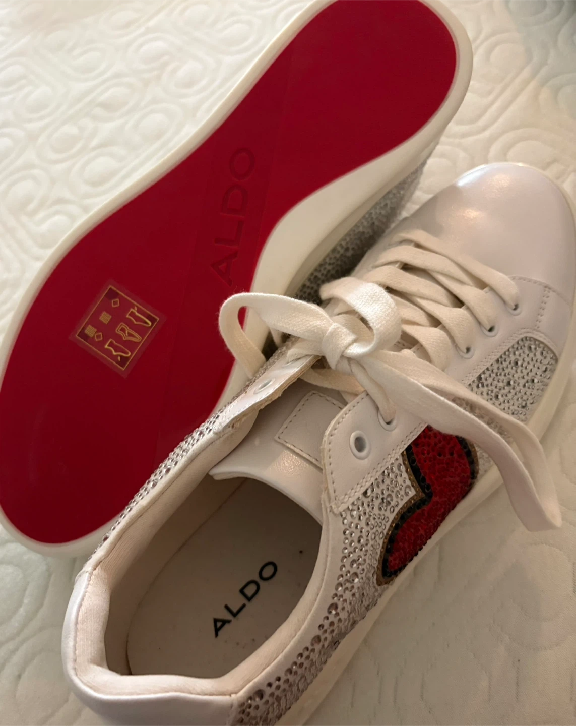 These are a pair of white ALDO sneakers with heart detailing. They have a red sole and are embellished with sparkly rhinestones.
