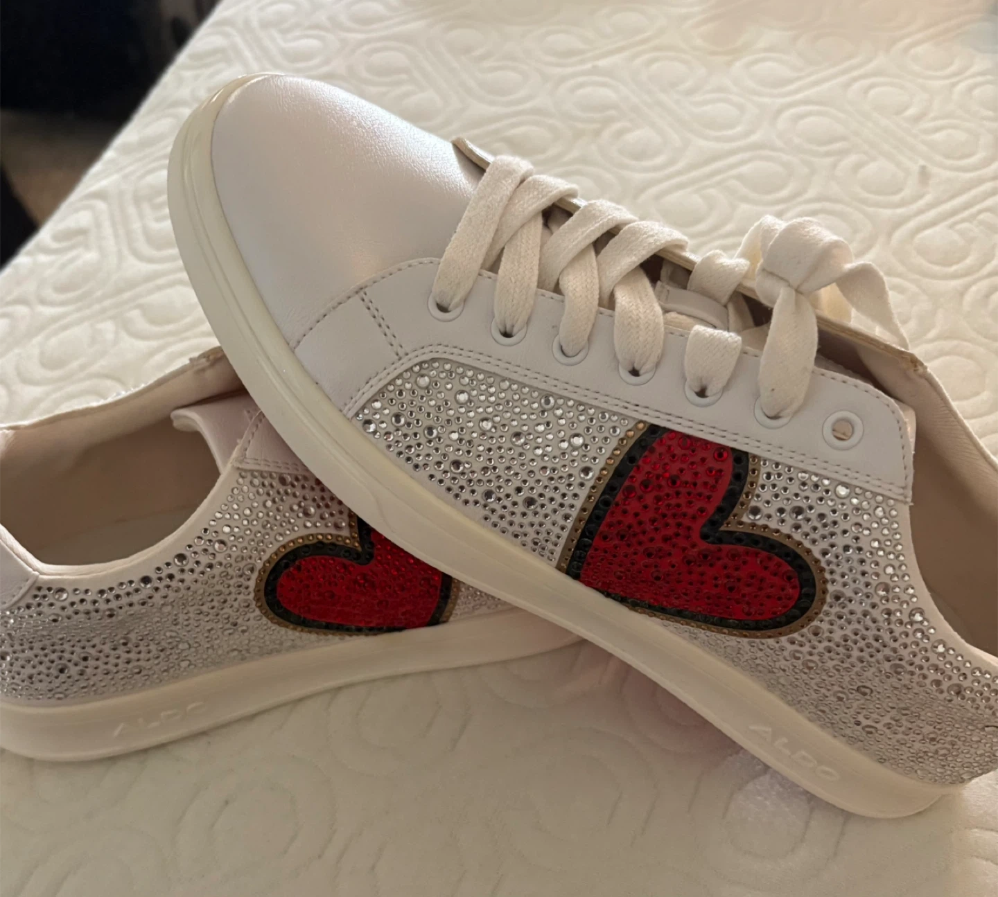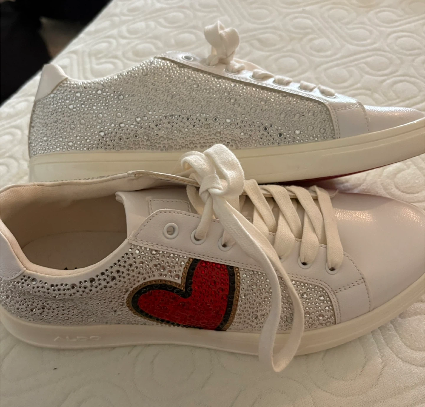 These are a pair of white ALDO sneakers with heart detailing. They have a red sole and are embellished with sparkly rhinestones.