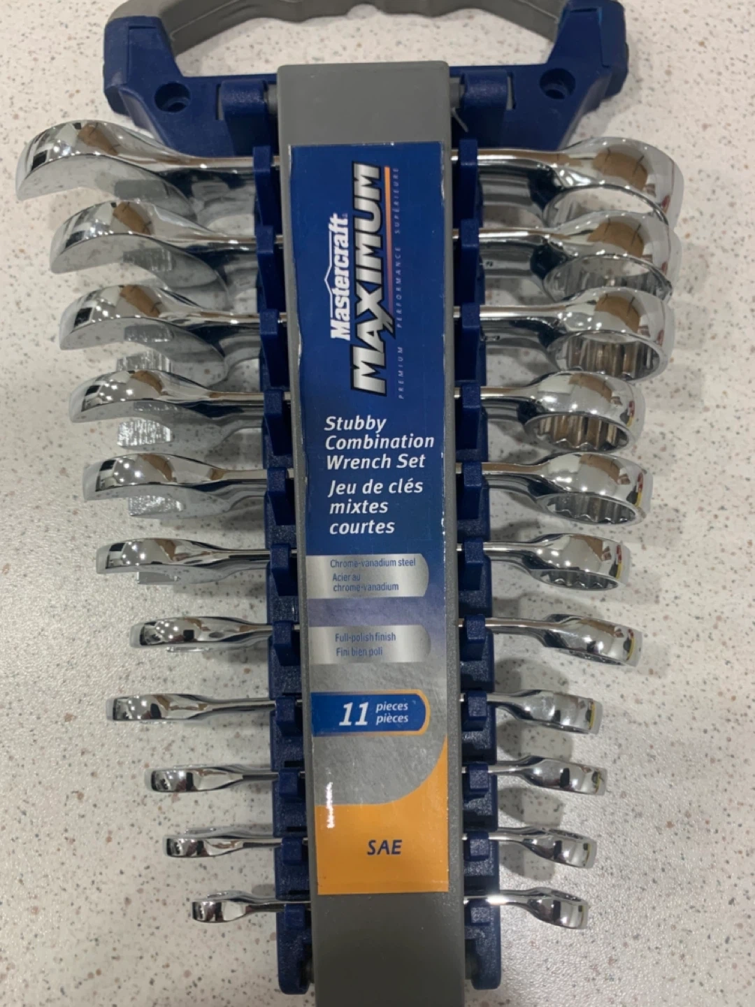 Selling a Mastercraft Maximum Stubby Combination Wrench Set. It includes 11 pieces, all in standard sizes. The wrenches are made of chrome-vanadium steel and have a full polish finish.