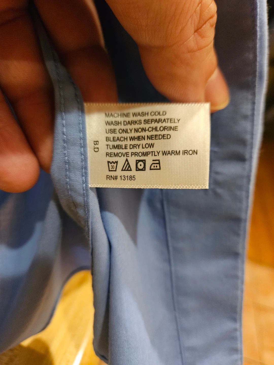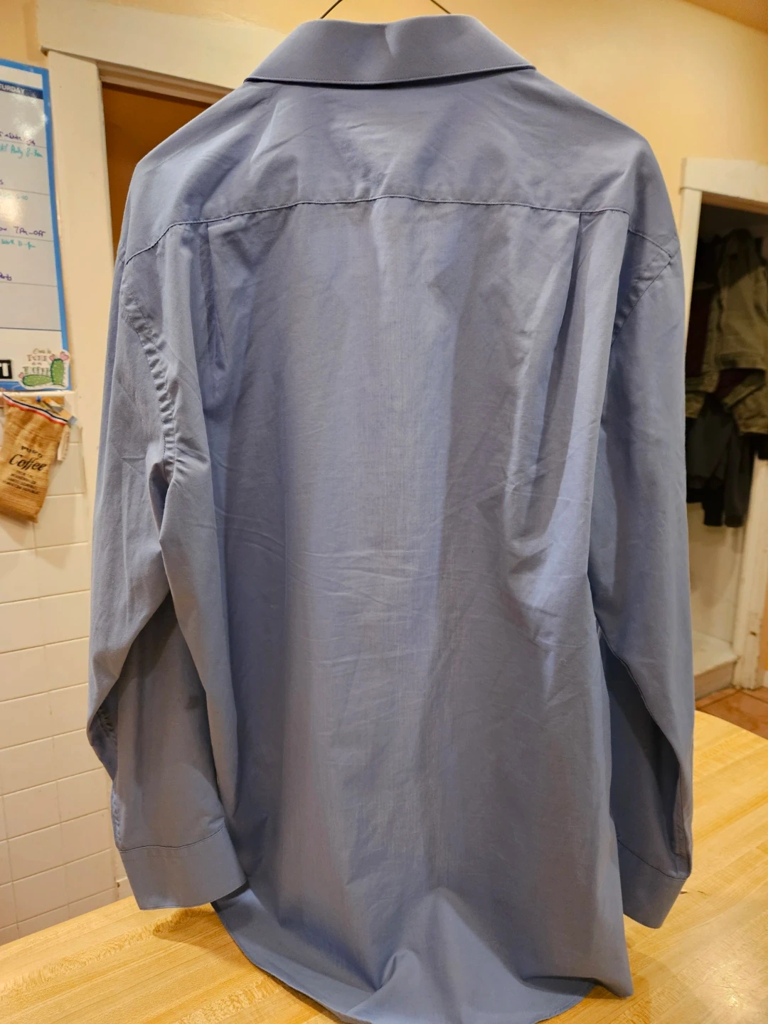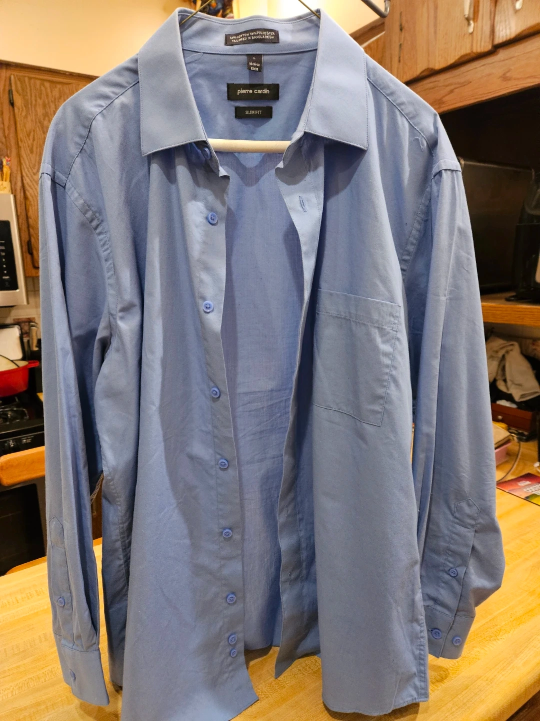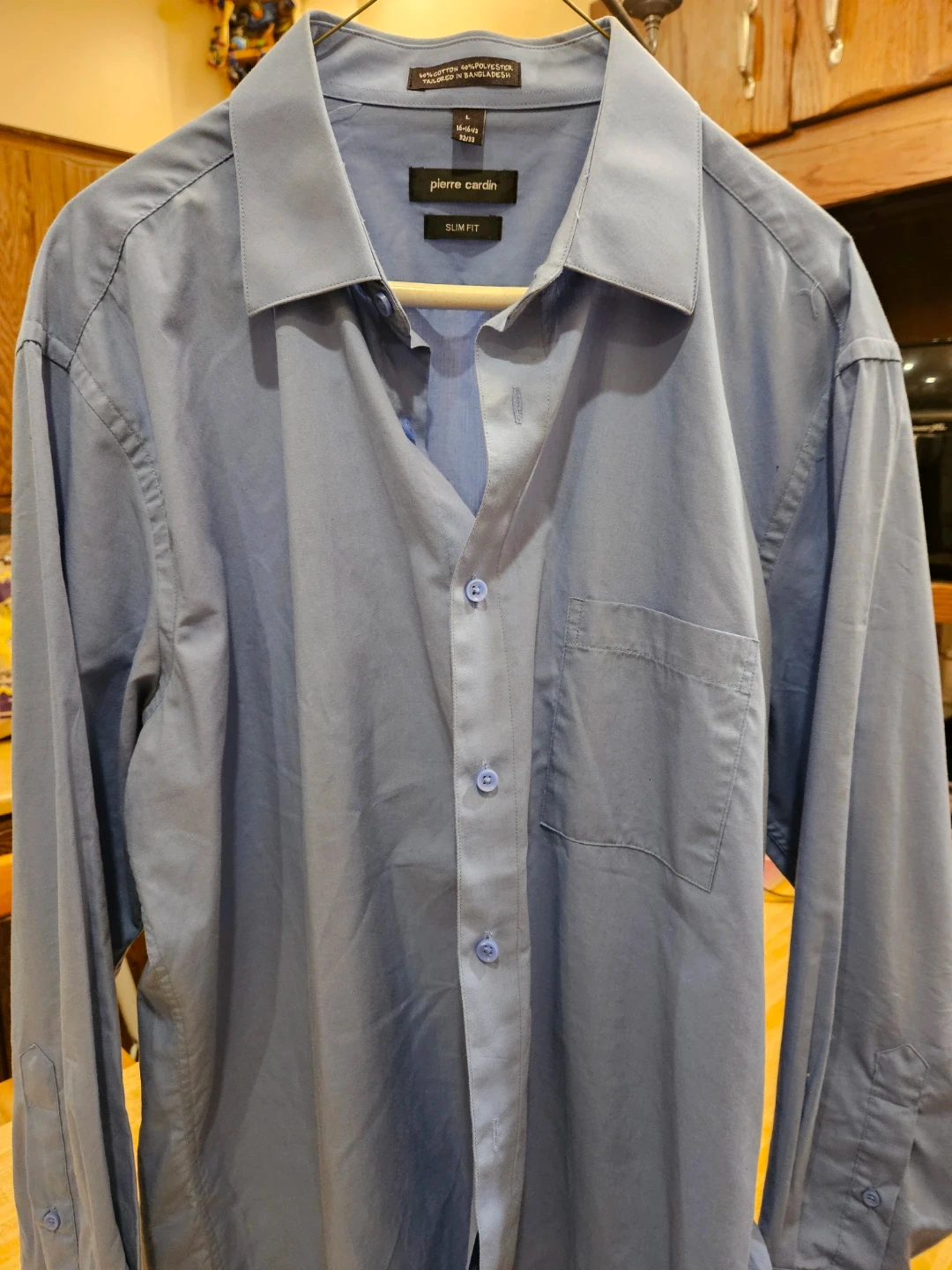 Selling a Pierre Cardin slim fit dress shirt in size L. It's a light blue color and made from 60% cotton and 40% polyester. The shirt is in good condition and ready for a new home