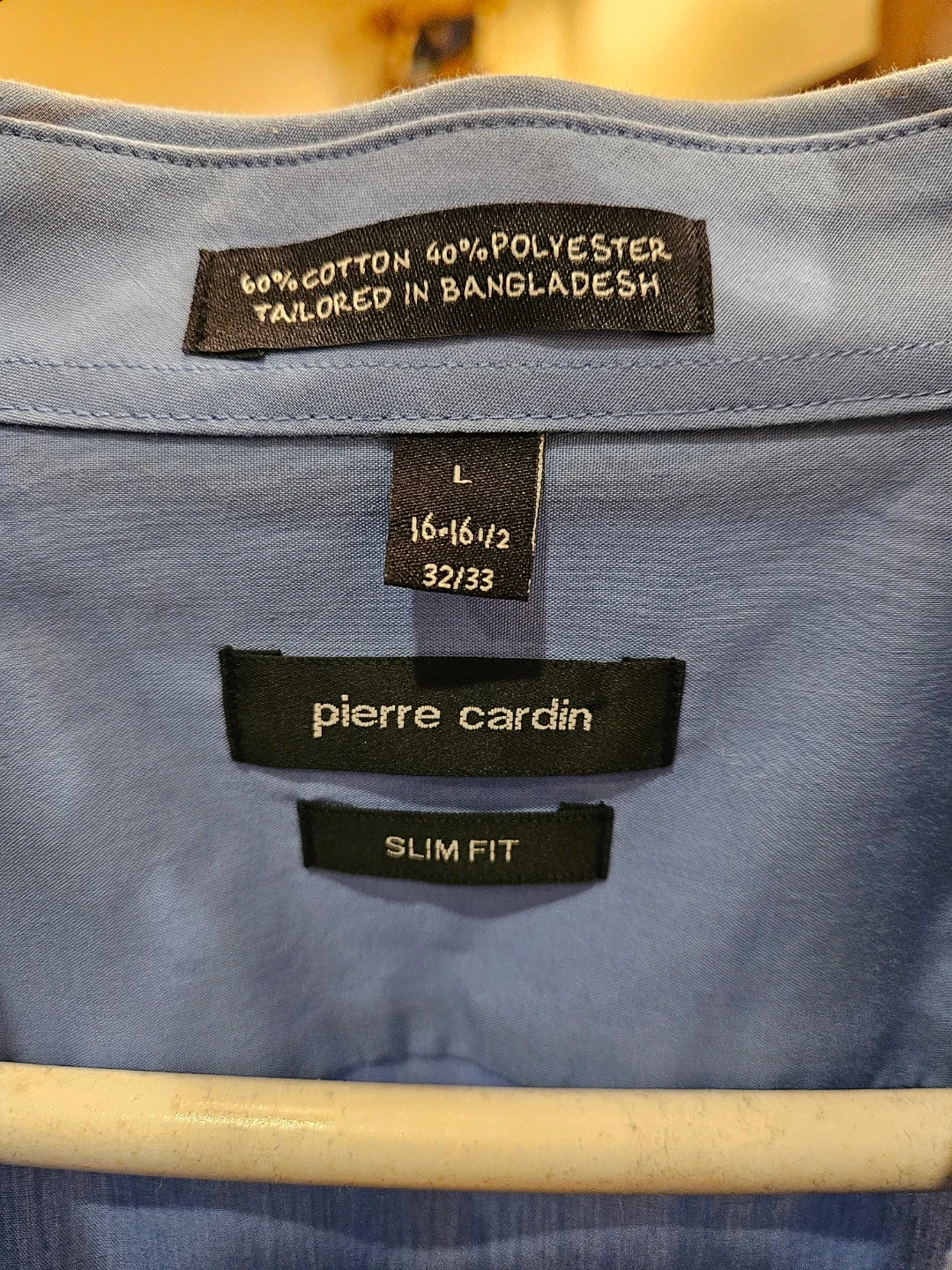 Selling a Pierre Cardin slim fit dress shirt in size L. It's a light blue color and made from 60% cotton and 40% polyester. The shirt is in good condition and ready for a new home
