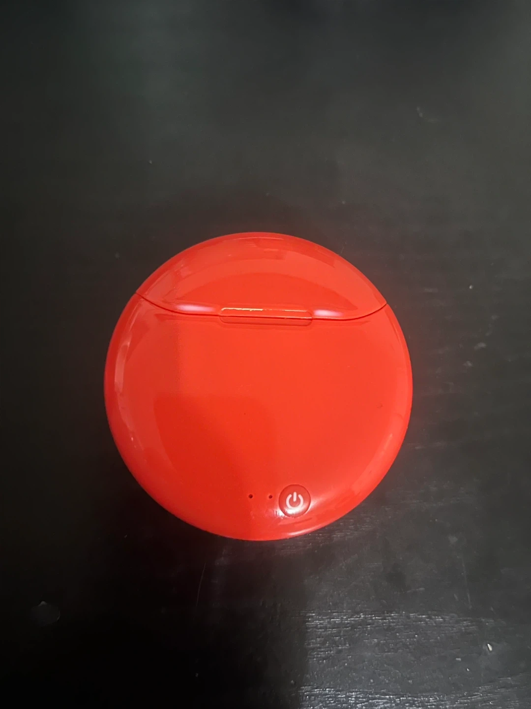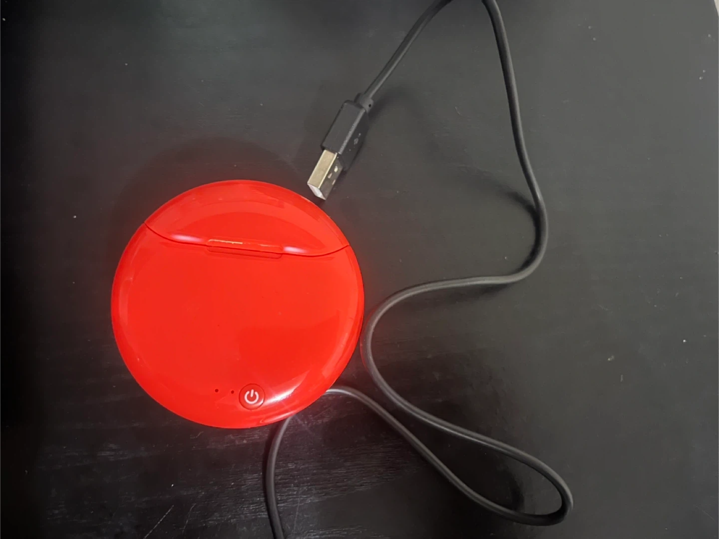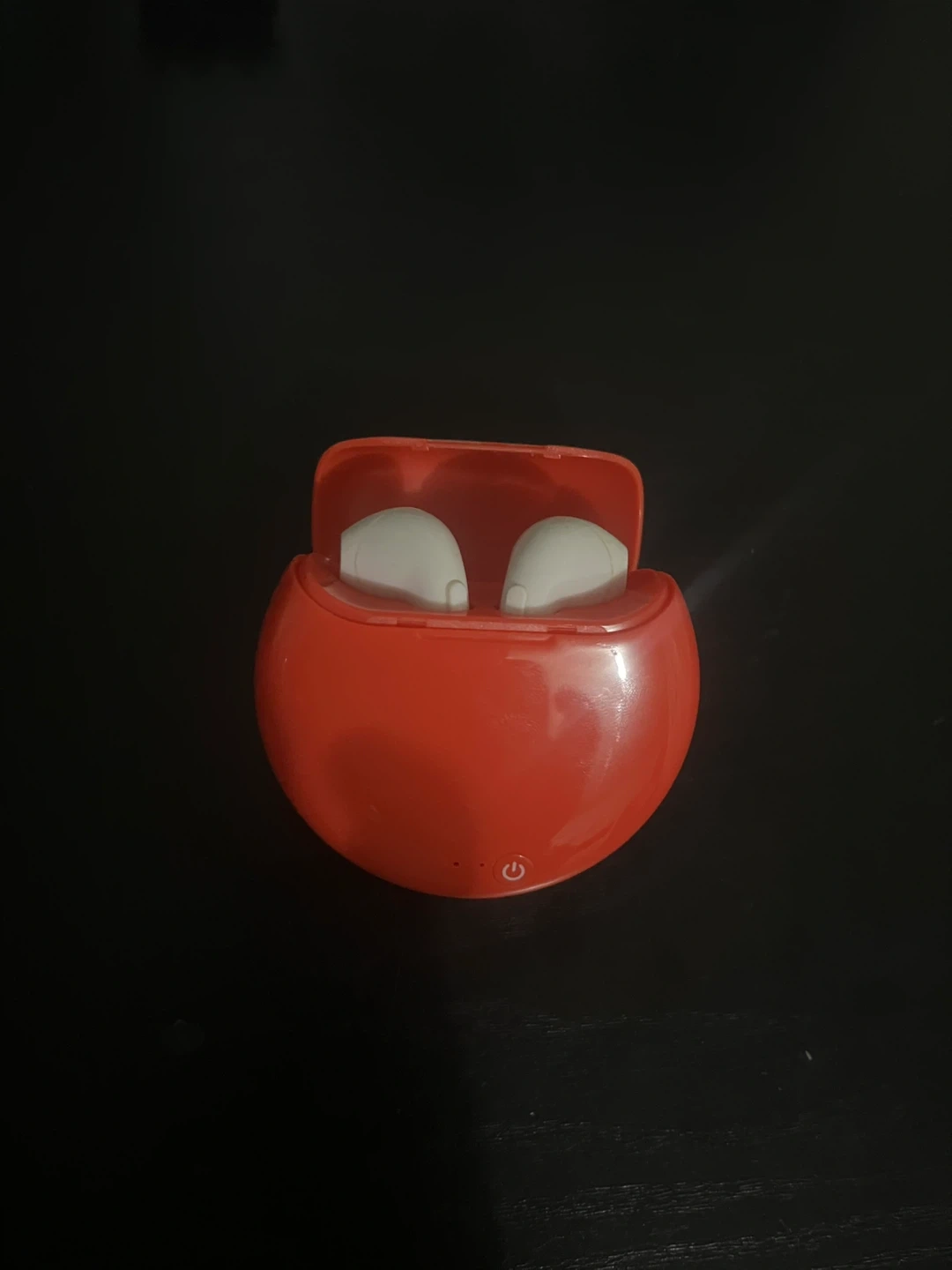 Selling a pair of wireless earbuds in a vibrant red charging case. They come with a charging cable so you can keep them powered up and ready to go!