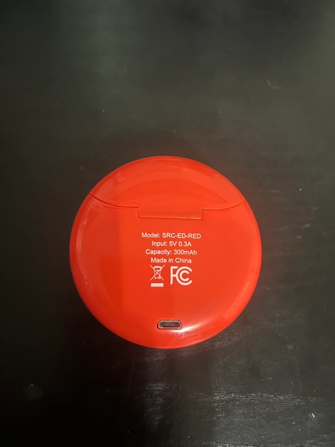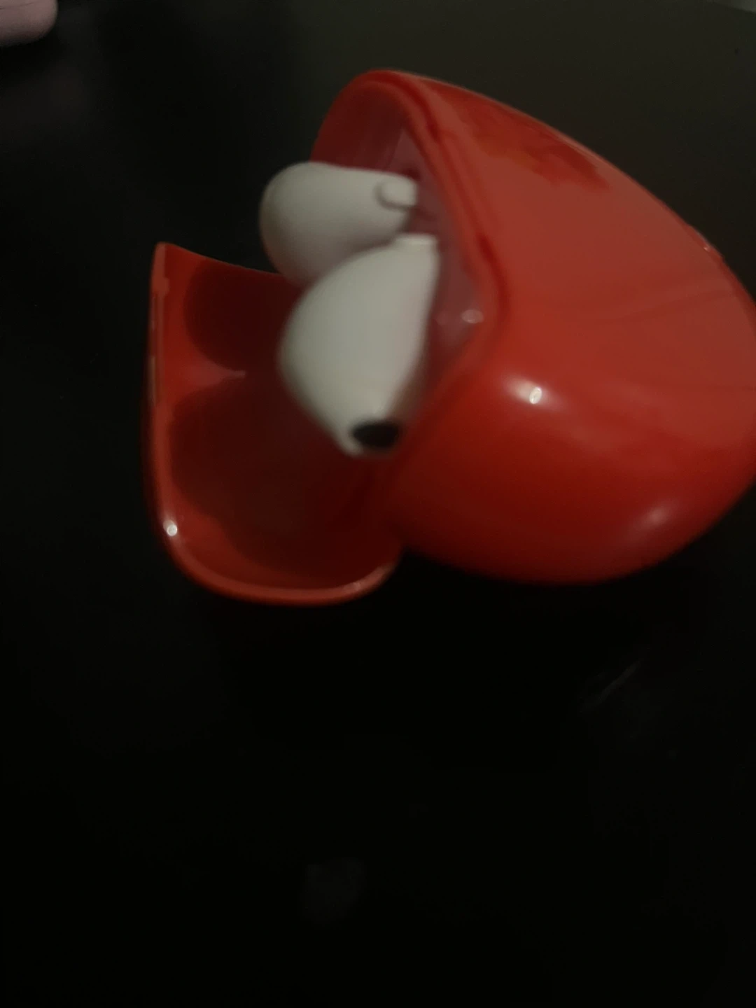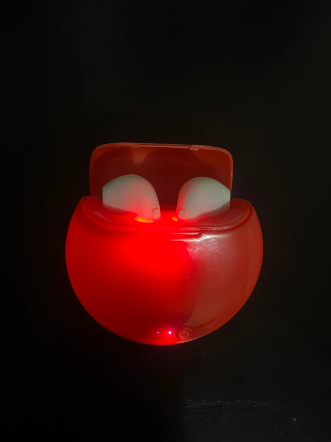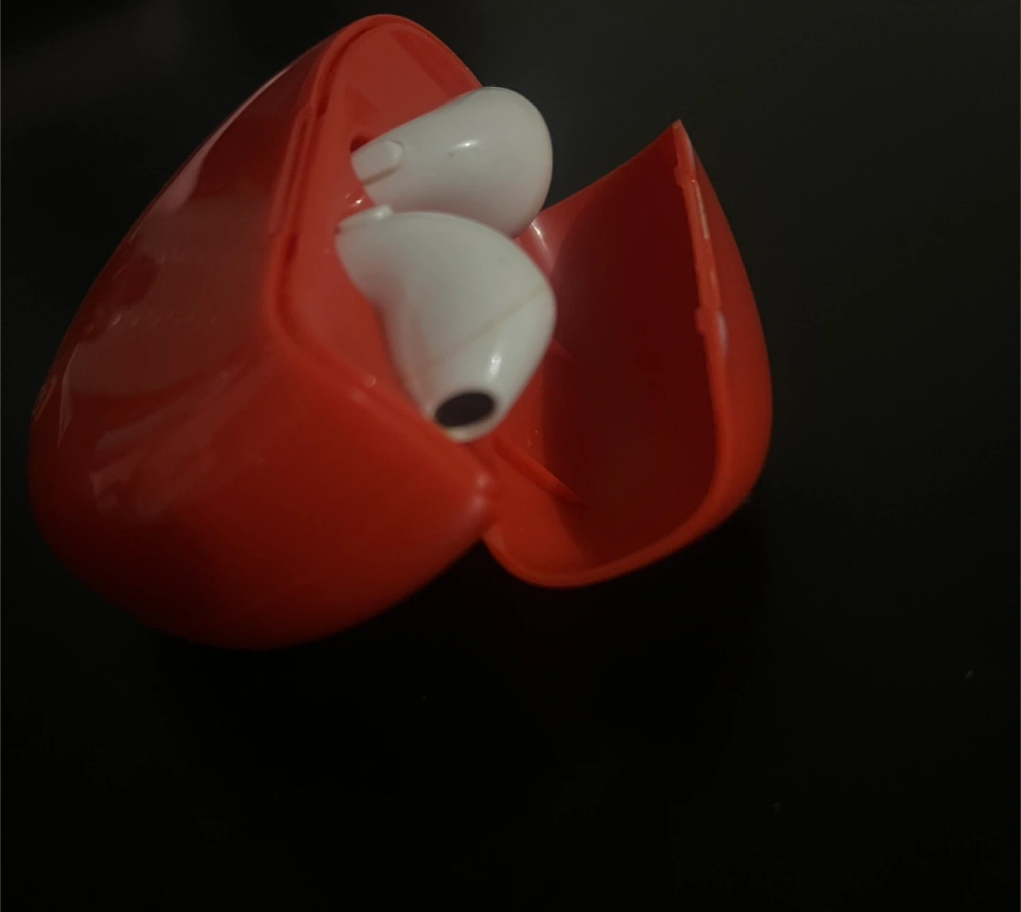 Selling a pair of wireless earbuds in a vibrant red charging case. They come with a charging cable so you can keep them powered up and ready to go!