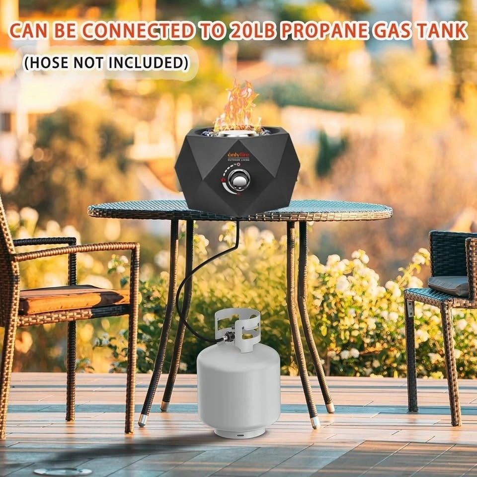 Fueled by propane gas. Includes fire pit, leg caps, a fully adjustable safety shutoff valve, and fireglass stones. Can be hooked up with a 1lb or a 20lb propane cylinder. Note: You need a 1lb to 20lb propane hose adapter to hook up with the 20lb propane tank (adapter not included). Measures 14 x 14 x 8 inch (L x W x H), weighs 12 lbs, with a total output of 5400 BTU/HR. Specially designed for tables with umbrella holes. The connection position for the fire pit and propane tank is at the bottom, so the propane tanks can be hidden perfectly. Made of durable steel frame with a protective enamel finish, which is rust-proof and heat resistant, perfect for both indoor and outdoor use. The modern elegant polygon appearance with simplistic line design is very attractive and matches most styles of room or patio garden. Great for using it as a bonfire pit to create a lively warm atmosphere for backyard gatherings, outdoor restaurants, camping, RV travels, and beach parties throughout all seasons. Smokeless flame & mess-free campfire - no smoke and no ash, providing you with a clean, safe, and cozy campfire experience.