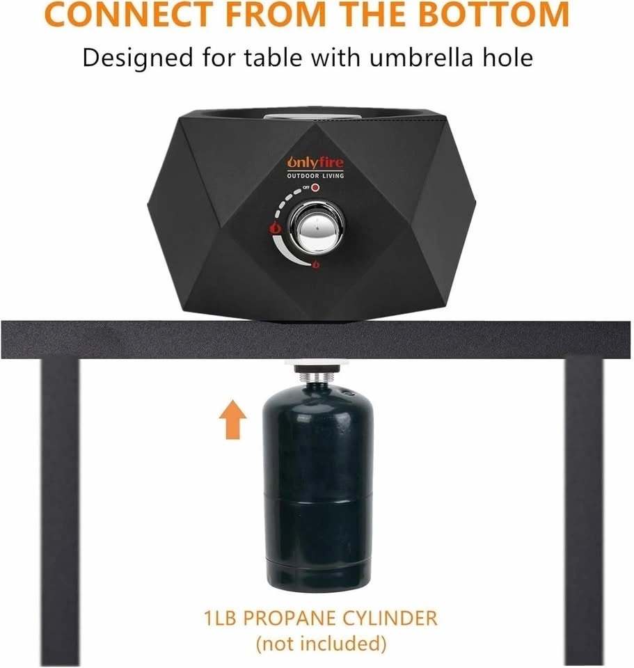 Fueled by propane gas. Includes fire pit, leg caps, a fully adjustable safety shutoff valve, and fireglass stones. Can be hooked up with a 1lb or a 20lb propane cylinder. Note: You need a 1lb to 20lb propane hose adapter to hook up with the 20lb propane tank (adapter not included). Measures 14 x 14 x 8 inch (L x W x H), weighs 12 lbs, with a total output of 5400 BTU/HR. Specially designed for tables with umbrella holes. The connection position for the fire pit and propane tank is at the bottom, so the propane tanks can be hidden perfectly. Made of durable steel frame with a protective enamel finish, which is rust-proof and heat resistant, perfect for both indoor and outdoor use. The modern elegant polygon appearance with simplistic line design is very attractive and matches most styles of room or patio garden. Great for using it as a bonfire pit to create a lively warm atmosphere for backyard gatherings, outdoor restaurants, camping, RV travels, and beach parties throughout all seasons. Smokeless flame & mess-free campfire - no smoke and no ash, providing you with a clean, safe, and cozy campfire experience.