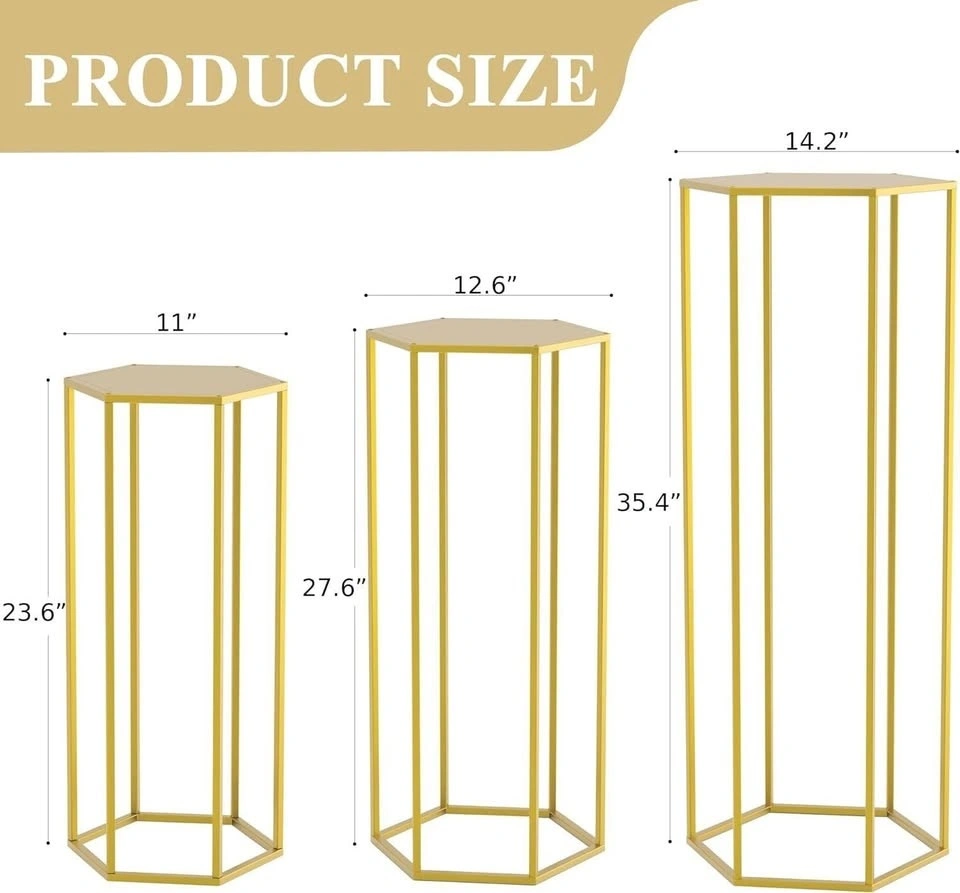 Hexagon Pedestal Stand Hexagonal cylinder pedestal stands for parties with antirust-resistant coating which is waterproof and rustproof, smooth ending without sharp edges, safe and durable for long time use. Easy Assembly The cylinder stands for party can be easily assembled with screws. Stylish hexagon apperance will nice for displaying your party decor, pedestal vases, centerpieces, greenery balls, flower bouquets or other decorative accents. 3 Sizes Metal Pedestal Stands Three cylinder pedestal stands measures L: 35.4in(H) *14.2(W), M: 27.6in(H) *12.6(W), S: 23.6in(H) *11(W). They can be set individually in different area, or dispaly them together. The cylinder tables for parties will save space when stack three pedestal stands together. Fashion Deisgn Geometric hexagon shape of metal cilindros para decoraciones de fiestas can be used as a pedestal stand, wedding flower holder or art stand. The hollow bottom design of gold pedestal stand can also store some small items and greenery, which is practical and beautiful. Wide Applications This metal pedestal stands will be an ideal gift choose for your families or friends. Cilindros para fiestas redondos blancos can not only be used as art display stand, plant stand or an end table to decorate your living room, but aslo as a decoration for a wedding, Christmas party or celebration ceremonies.
