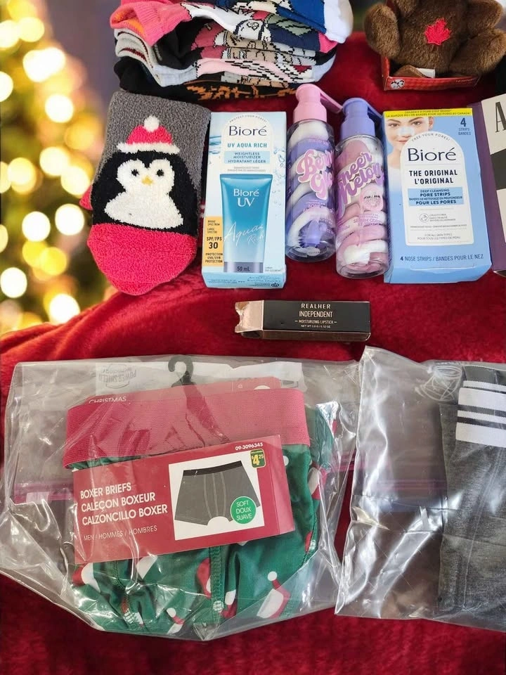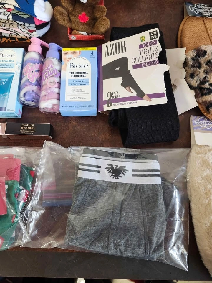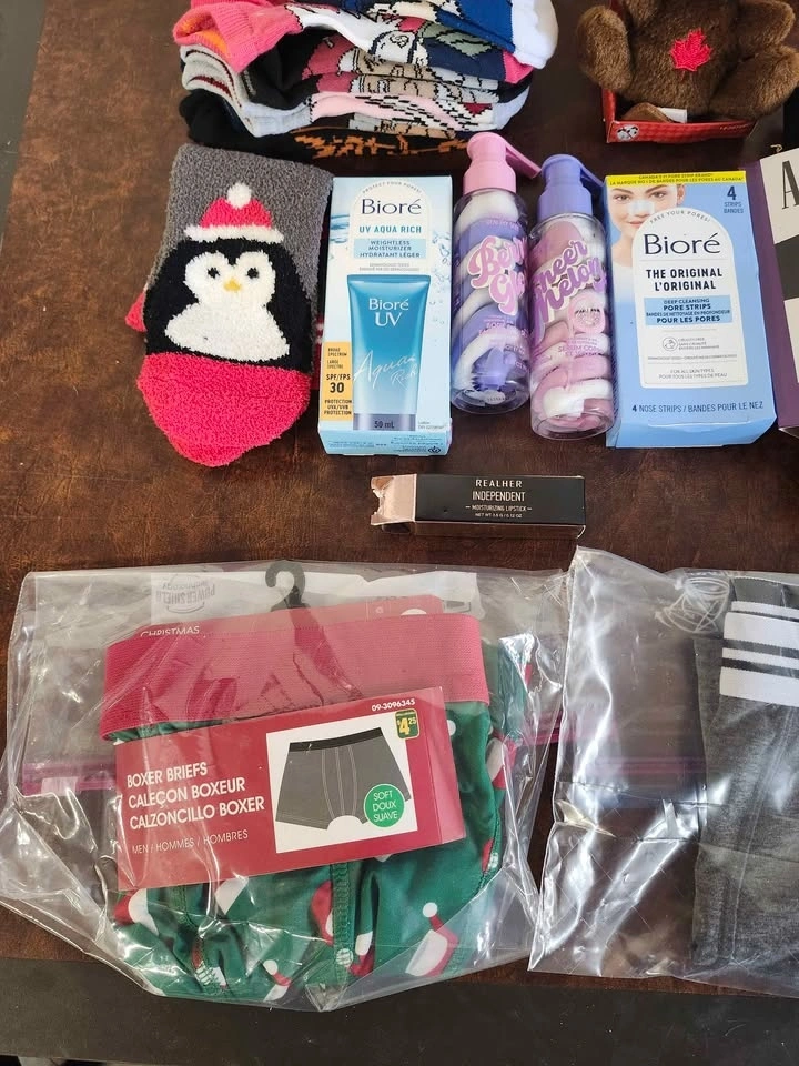 Socks and Slippers: Various pairs of socks, some with Christmas themes like a penguin, and a pair of leopard print fuzzy slippers and plain beige slippers are visible.