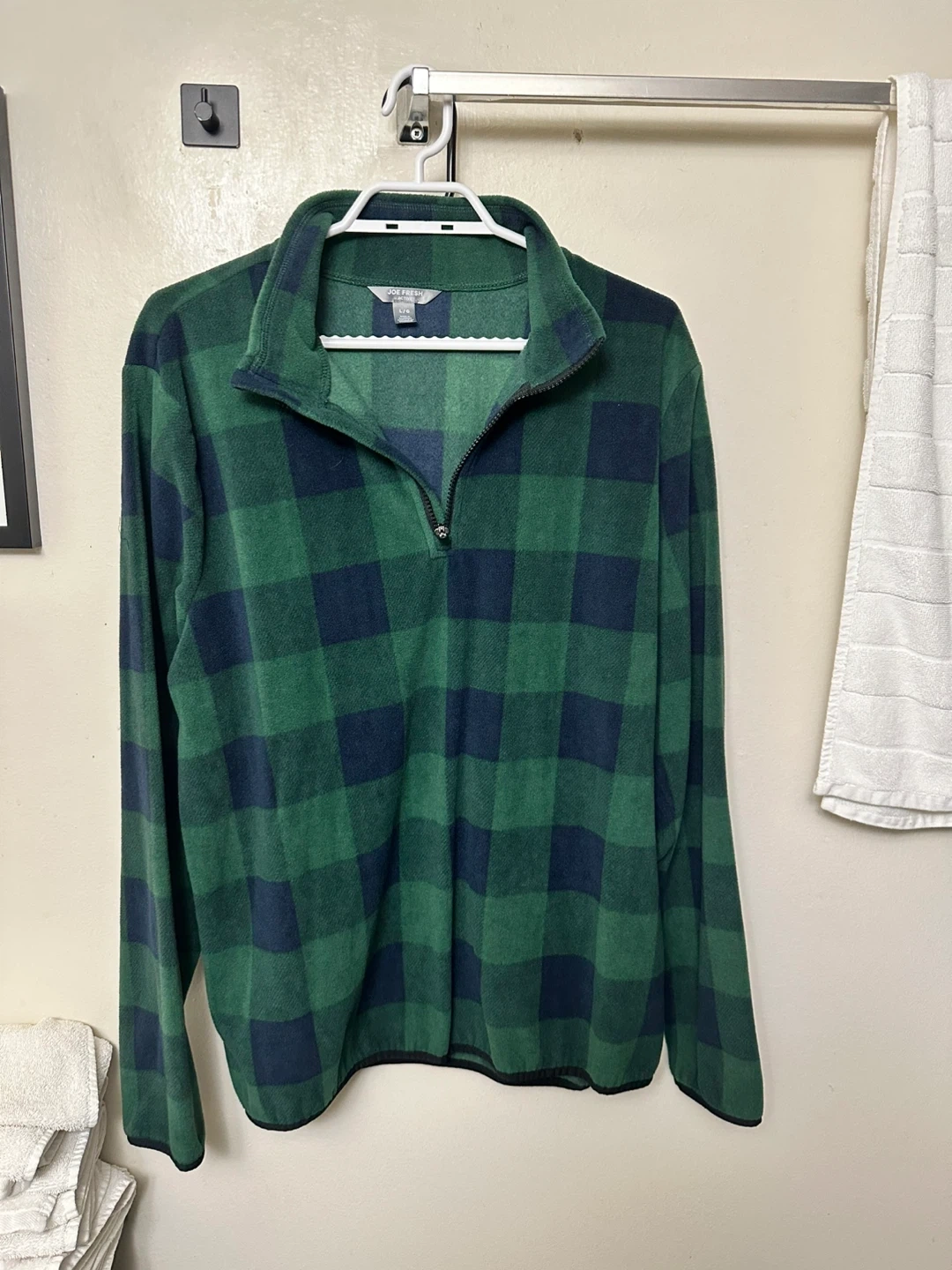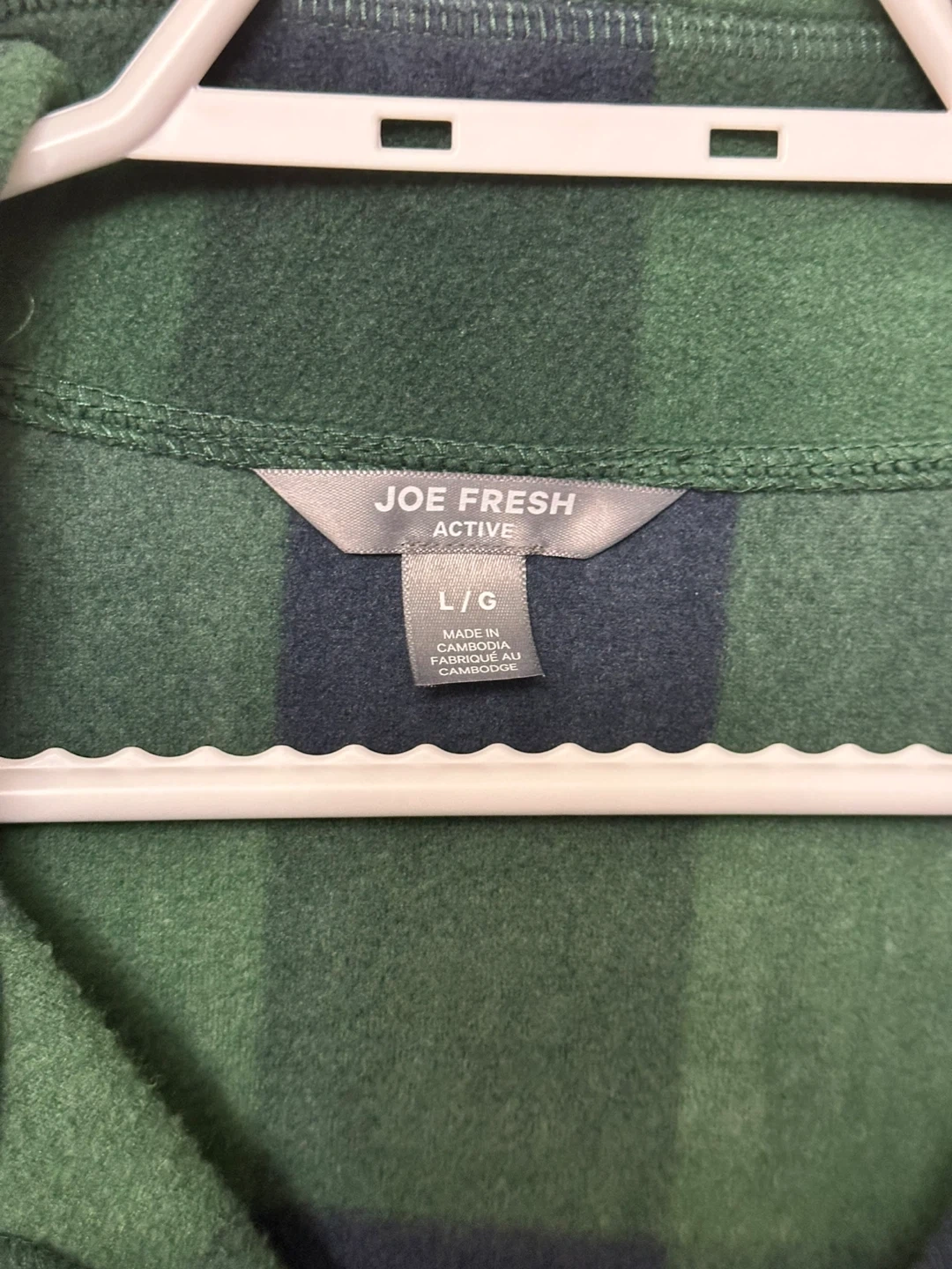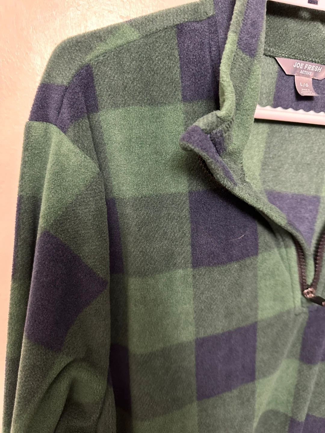 Cozy Joe Fresh Active fleece pullover in a green and navy plaid pattern. It's a size L/G and in great condition! Perfect for layering on chilly days