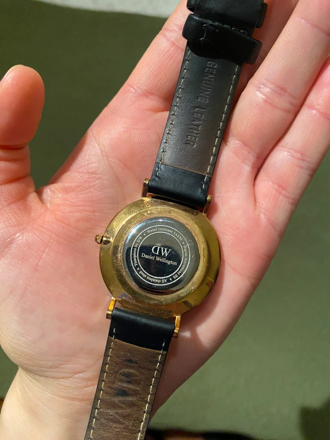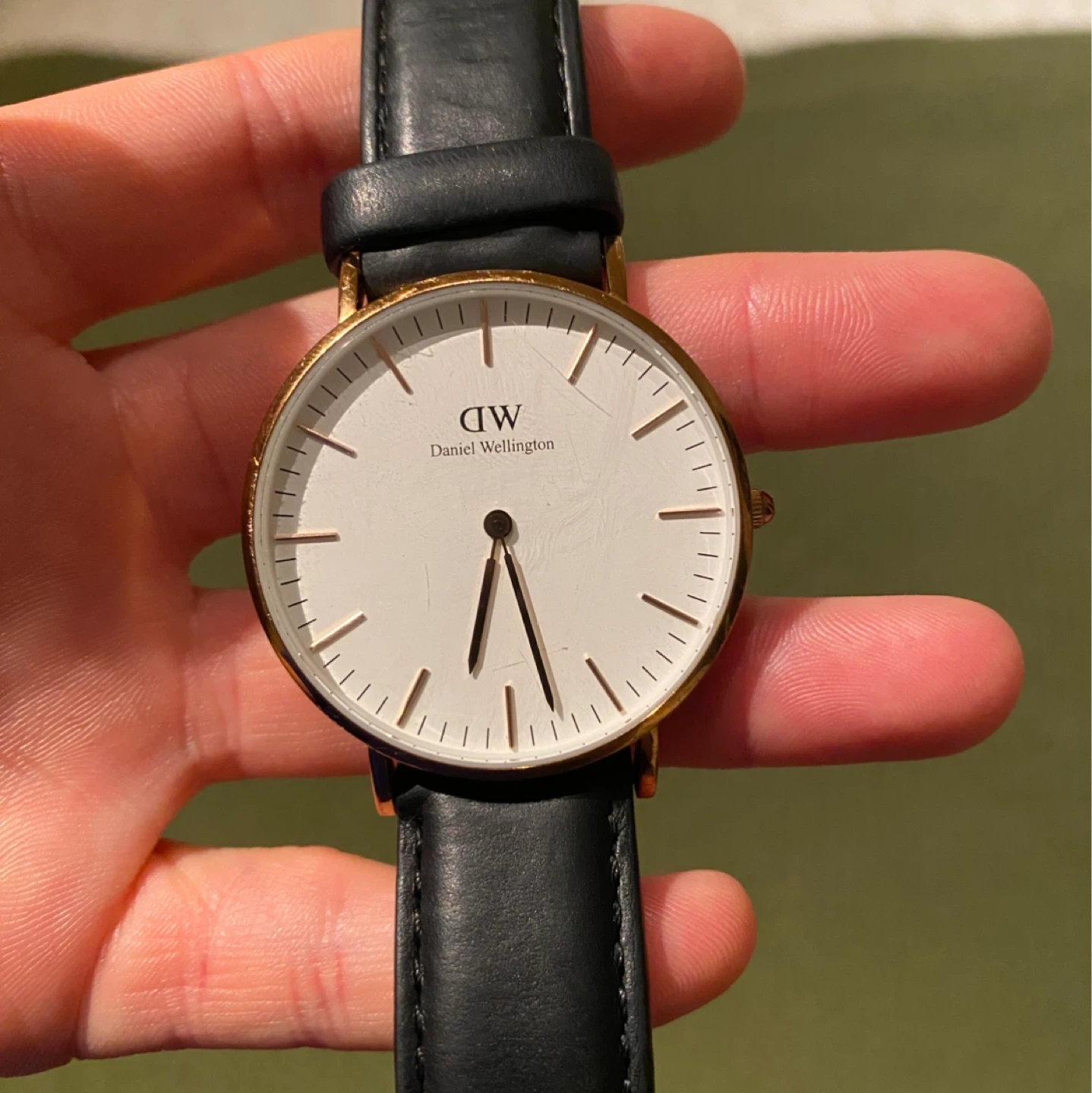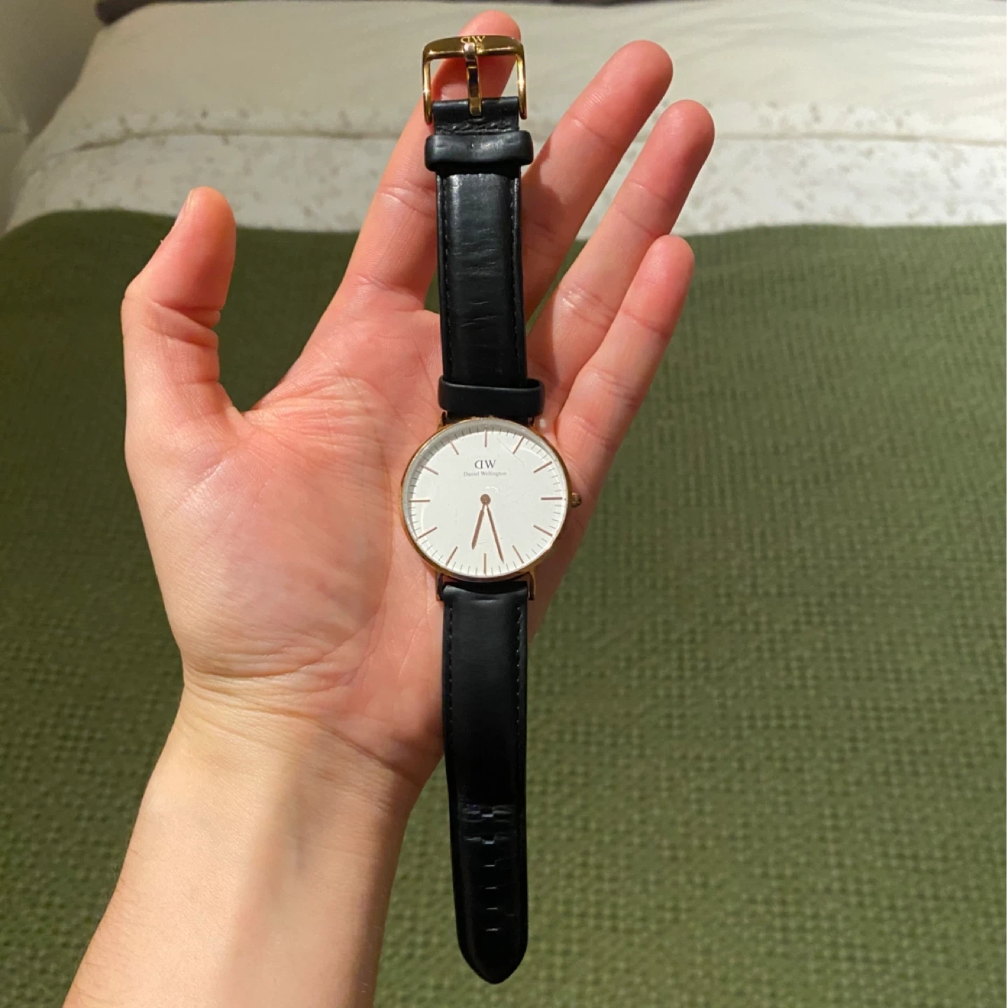 Daniel Wellington watch in good, working condition. Rose gold stainless steel trim and black genuine leather strap. Watch face has few small scratches. Needs new battery (standard).