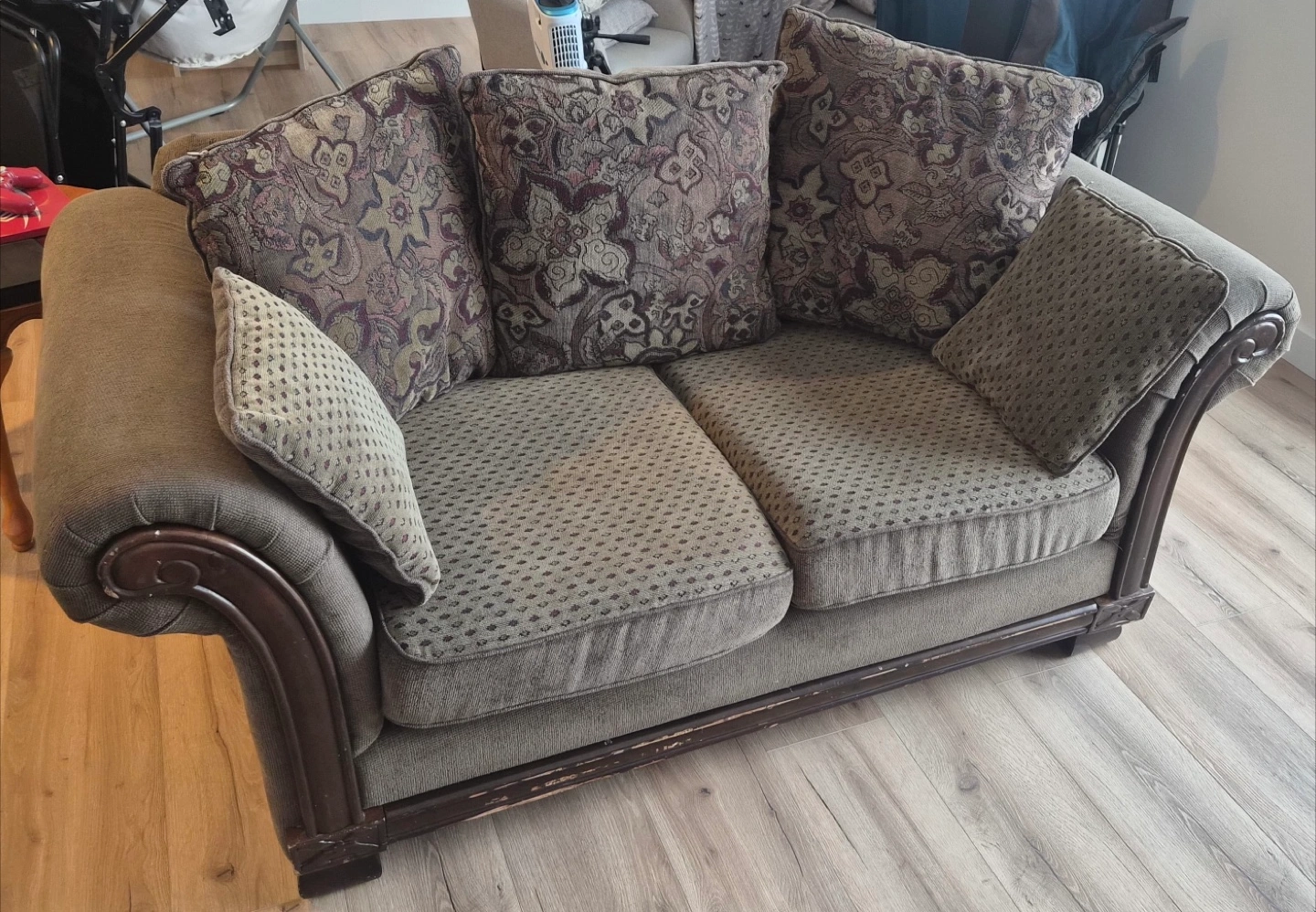Selling a comfortable 2-seater sofa with elegant solid wood armrests and a classic design. Upholstered in a neutral tone with patterned cushions that add character. Very sturdy and supportive, perfect for a living room, study, or guest area. ✔️ Solid wood frame and arm details ✔️ Comfortable, deep seating ✔️ Includes all cushions shown ✔️ Classic and traditional, suits many interiors ✔️ Removable and washable cushion covers ✔️ Normal signs of use, structurally sound Selling as we are downsizing. Priced to sell 📍 Pick-up only