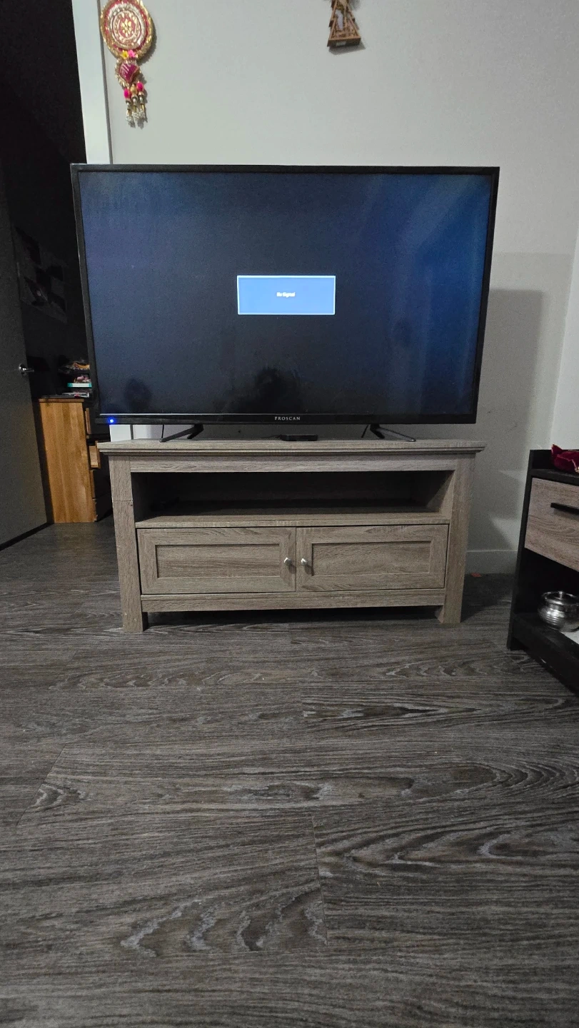 Selling a wooden TV stand in a light wood finish. It features an open shelf and 2 cabinets with doors for storage. Great for organizing your entertainment area