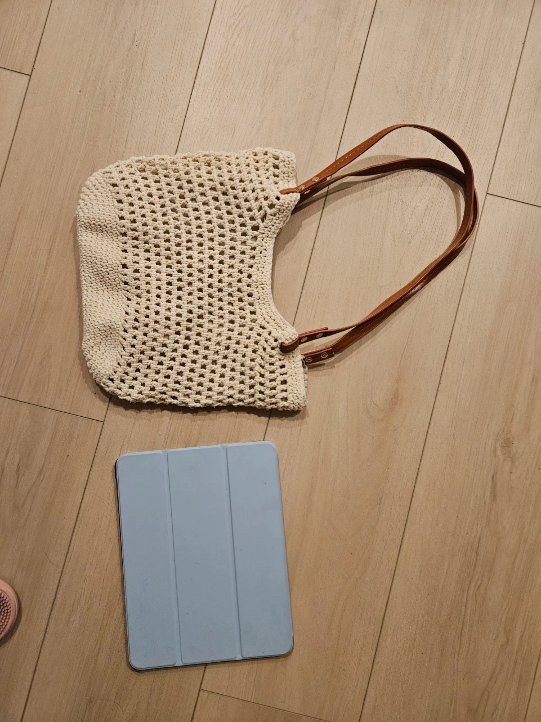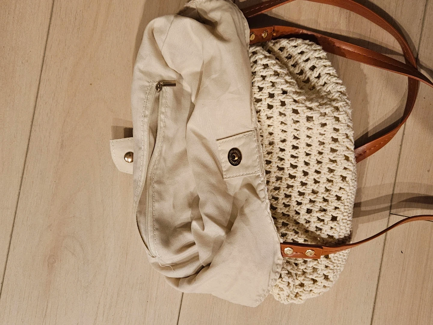 Selling a cute crochet tote bag! It has brown leather straps and a beige interior lining. Perfect for carrying your essentials. It's in great condition!