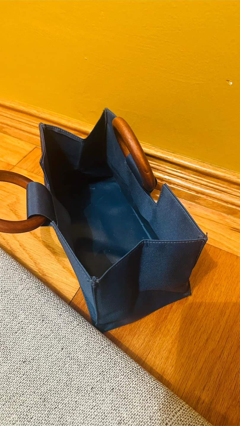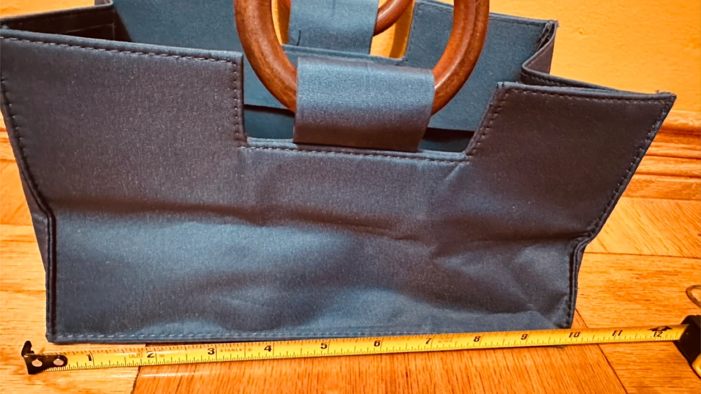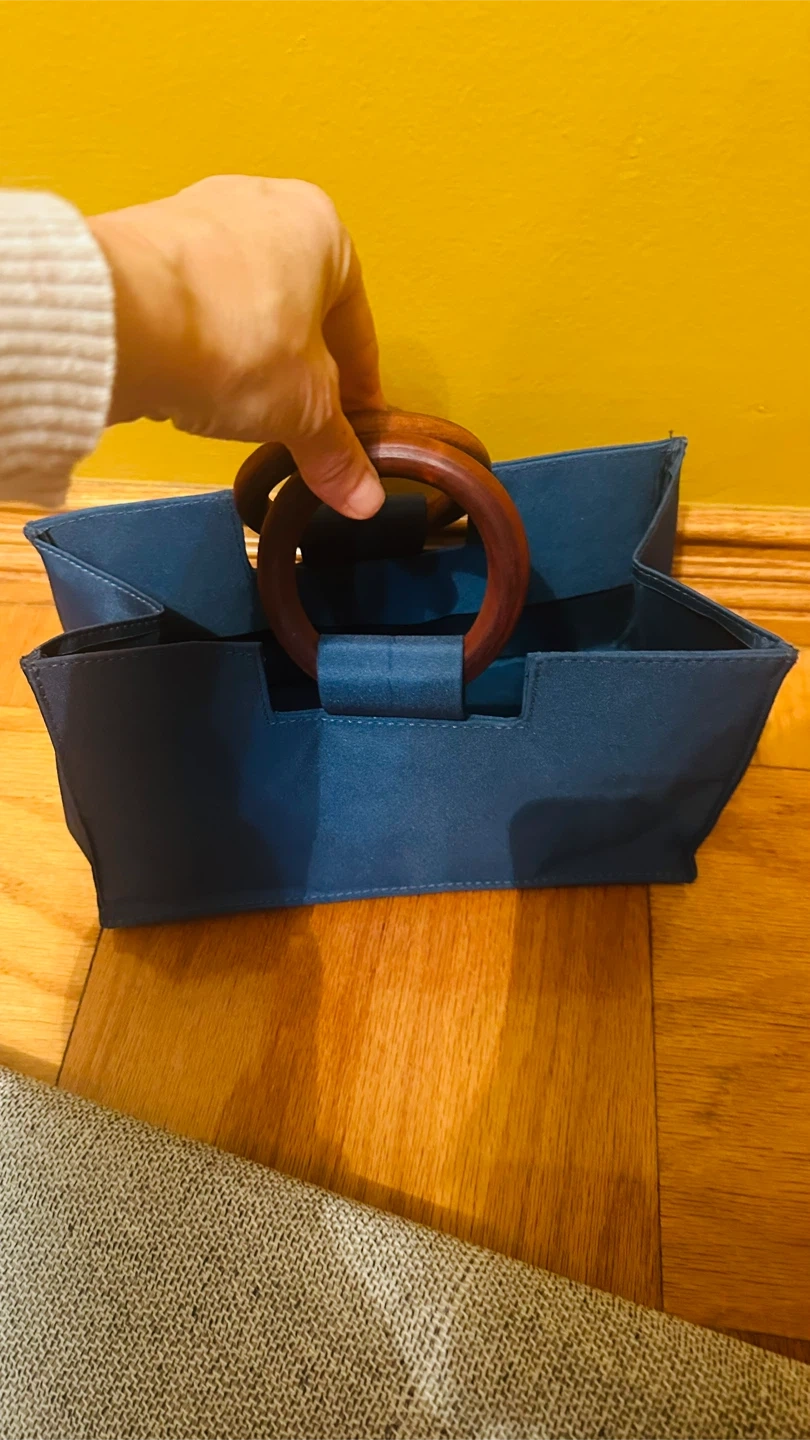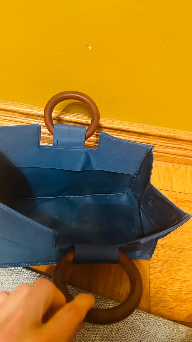 Here's a stylish blue tote bag with unique wooden handles! It's in great condition and ready to carry your essentials. The bag is a beautiful shade of blue and features sturdy wooden handles for a touch of elegance