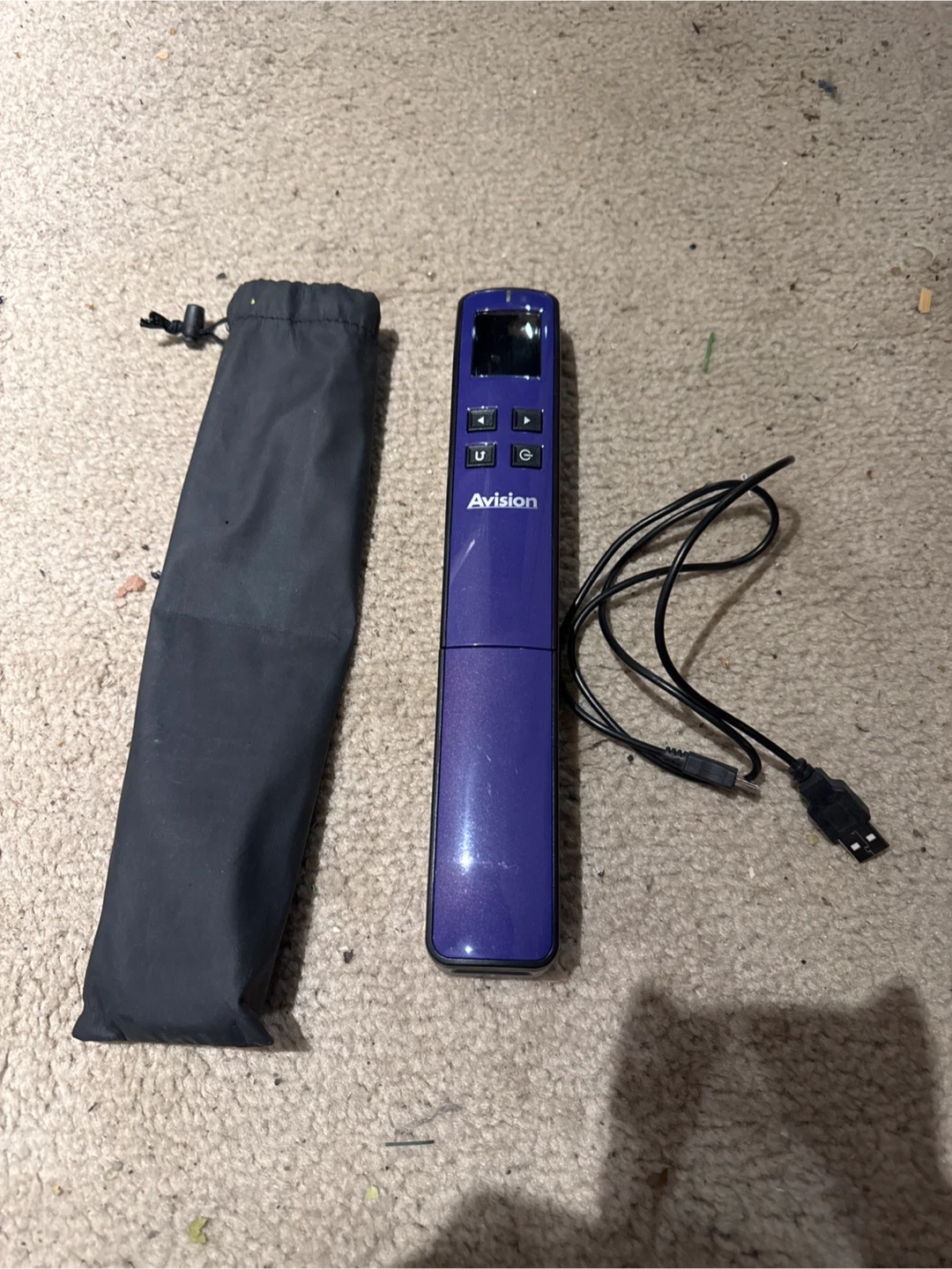 Selling an Avision wand scanner. It comes with its original bag and charger. Perfect for scanning documents or photos on the go!