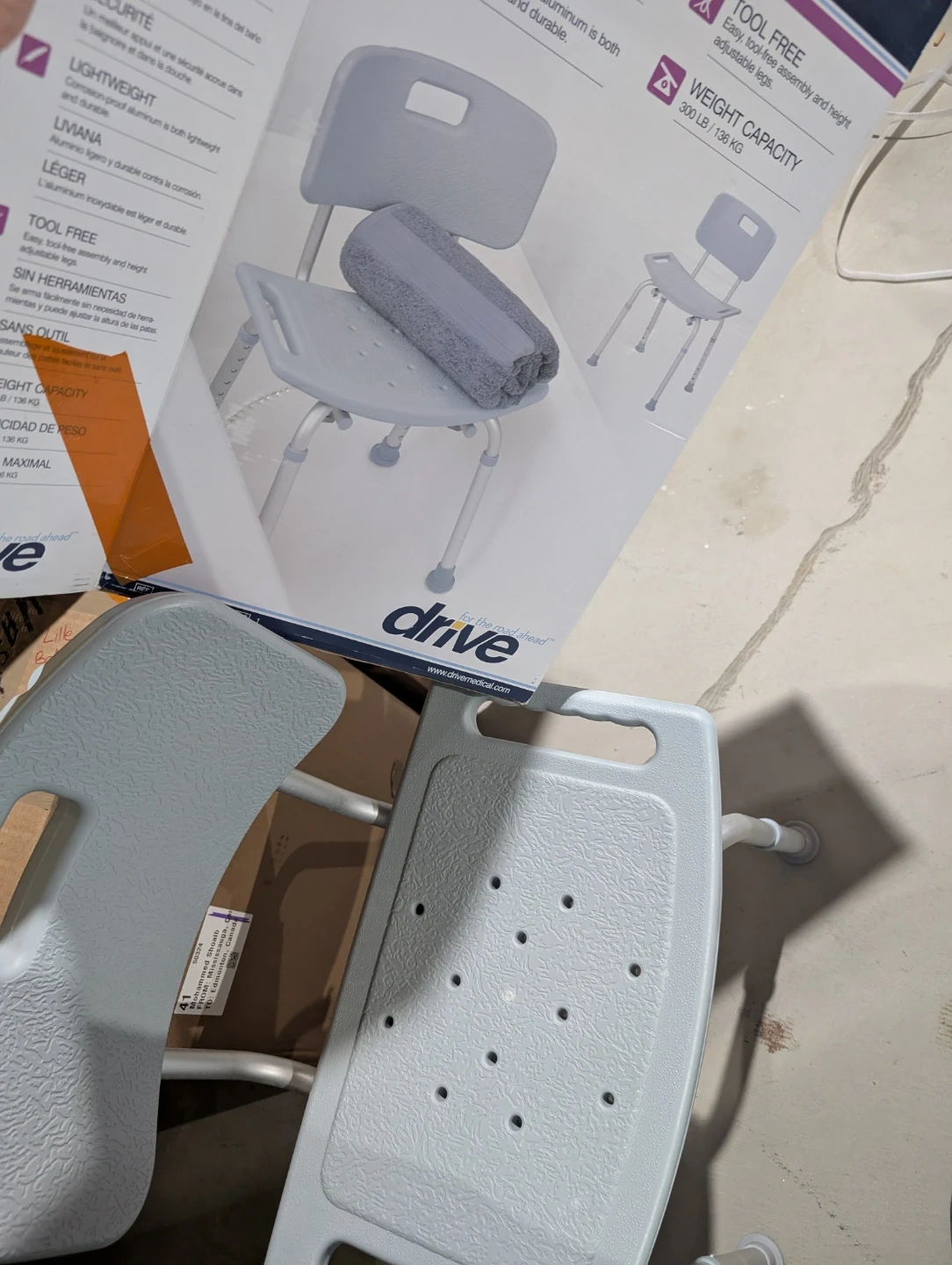 Selling a Drive Medical shower chair! It's lightweight and made with corrosion-proof aluminum, so it's durable and easy to move around. The legs are tool-free adjustable, making it easy to set the right height for anyone. It supports up to 300 lbs (136 kg)