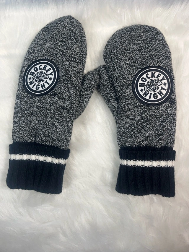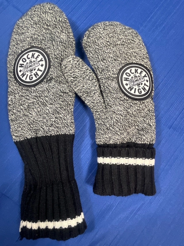 Stay cozy and show your Canadian pride with these Hockey Night in Canada mittens, perfect for keeping your hands warm during those chilly hockey games or winter outings! These mittens are in used condition, ready to keep you warm. These stylish mittens are the perfect accessory for any hockey fan. Whether you're cheering from the stands or braving the cold outdoors, they'll keep your hands snug and show off your love for the game. Grab them before the next big match! If the ad is still up, these mittens are still available!