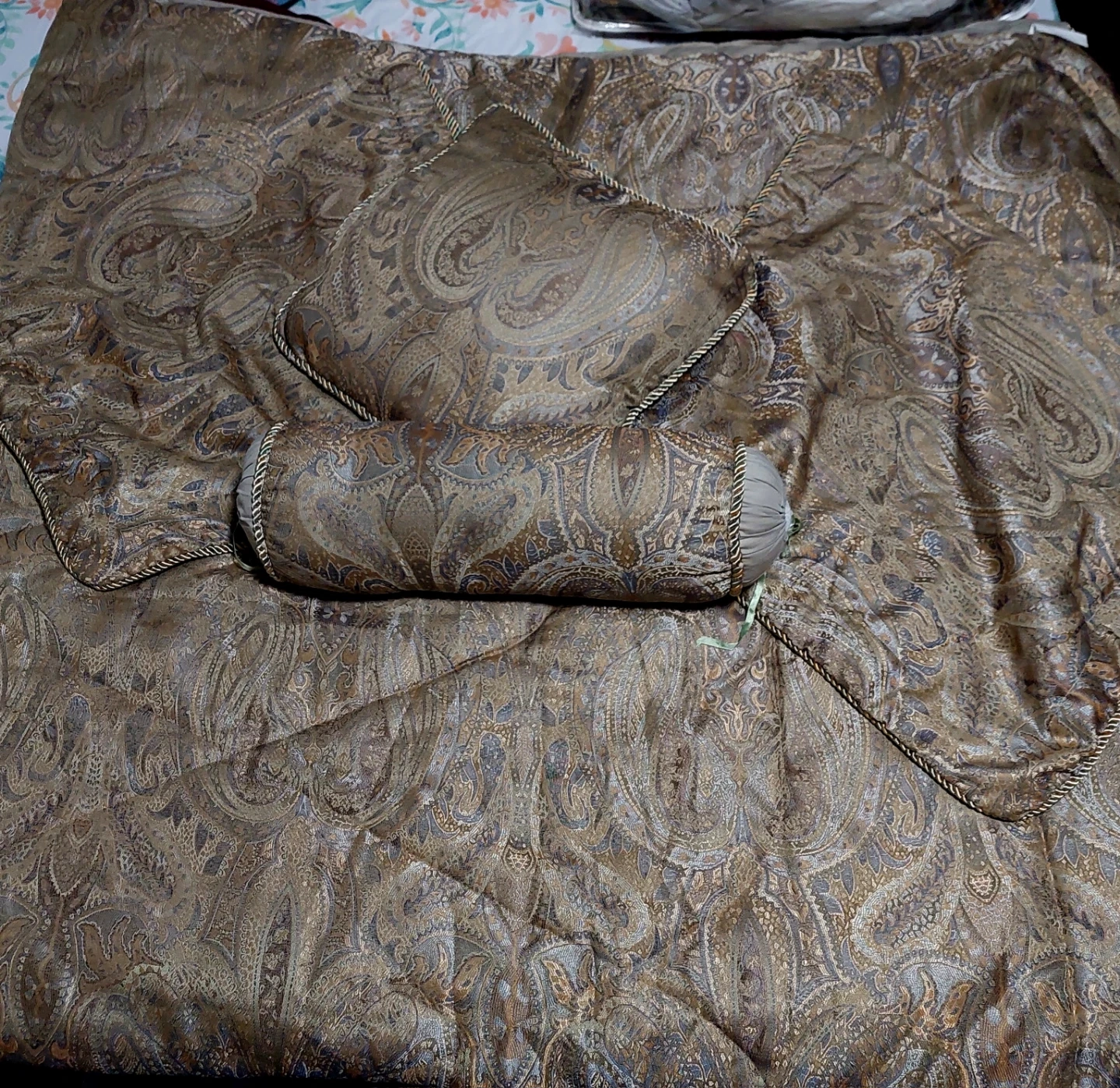 King size Cozy silk bedding set with a floral pattern, includes a comforter and matching pillows. Perfect for adding a touch of elegance to your bedroom!