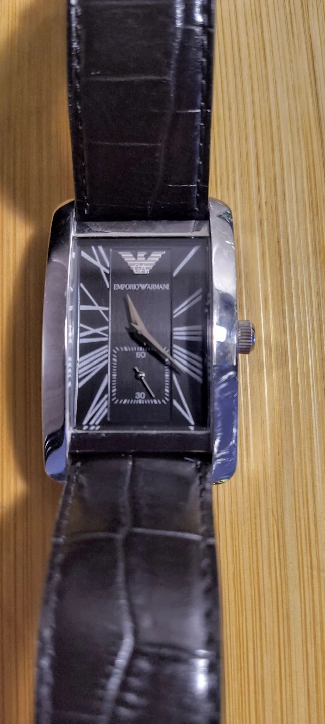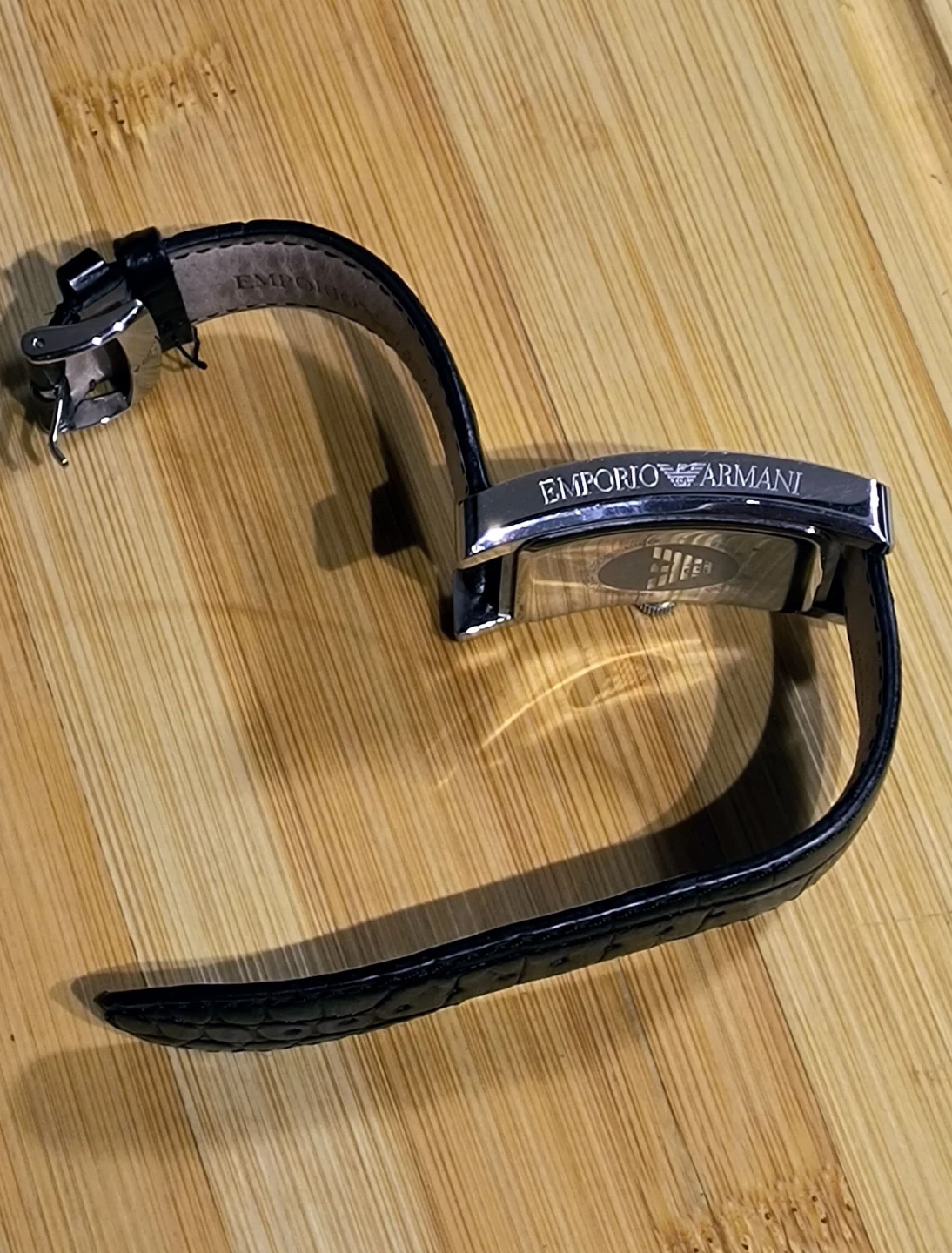 Selling a stylish Emporio Armani men's watch. It features a sleek black dial with a stainless steel case and a genuine leather band. A great addition to any outfit! It needs a Battery Replacement.