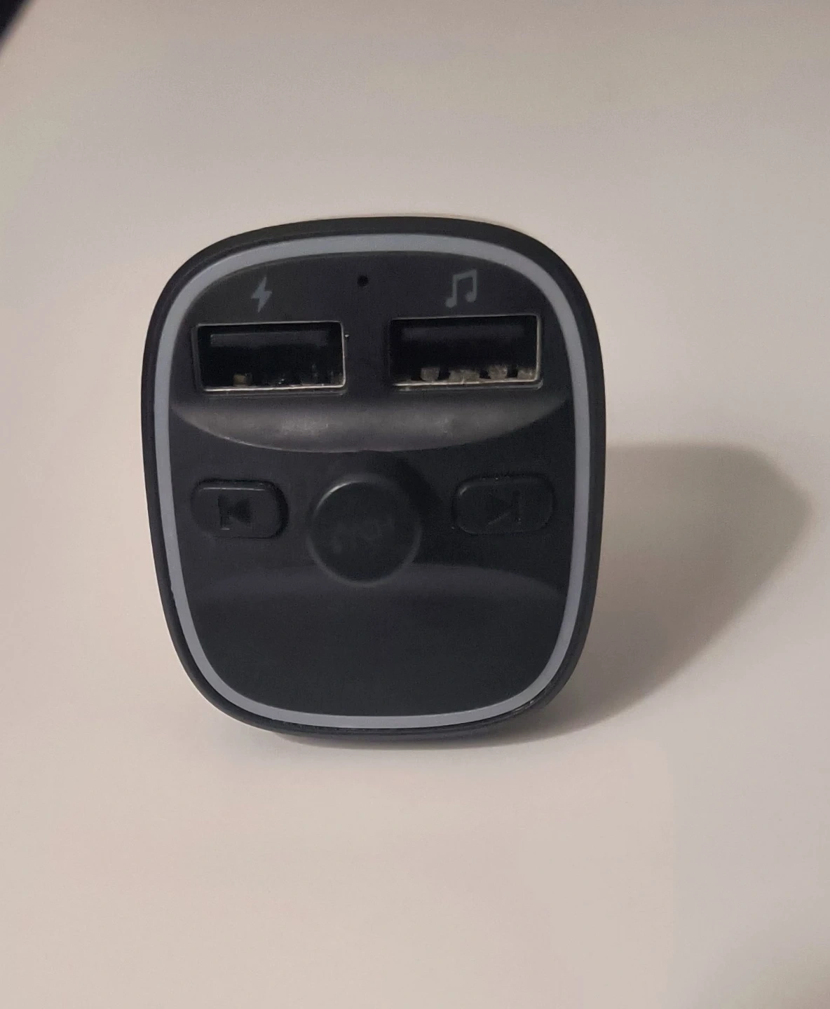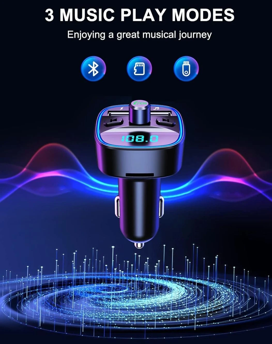 This Car Bluetooth FM Transmitter (T25) has dual USB ports for charging two devices at once! It features one-button control, a microphone, and an LED display. It also has an ambient light and a TF card slot. Charge up to 2 devices simultaneously with 5V/1A and 5V/2.4A outputs