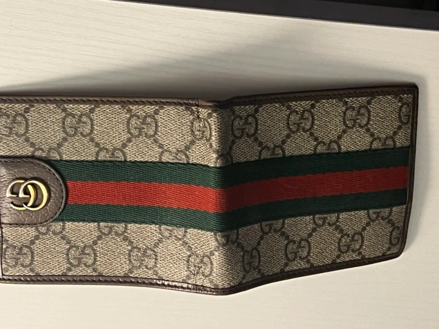 Selling a Gucci GG Supreme wallet. It features the iconic GG pattern with the green and red Web stripe. The wallet is in good condition and has plenty of slots for cards and cash. A classic and stylish accessory!