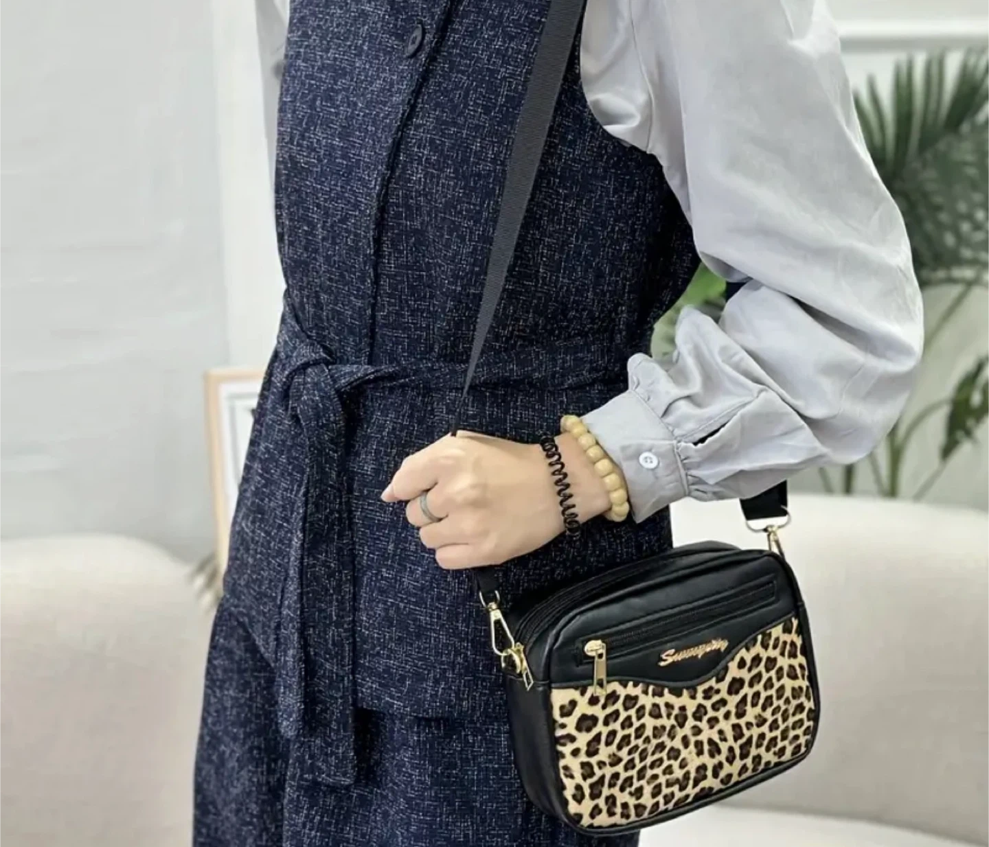 Here's a stylish Savvycity crossbody bag! It features a trendy leopard print design and a convenient size for everyday use. The bag has a black leather-like material and a gold-tone zipper. Perfect for adding a touch of flair to any outfit