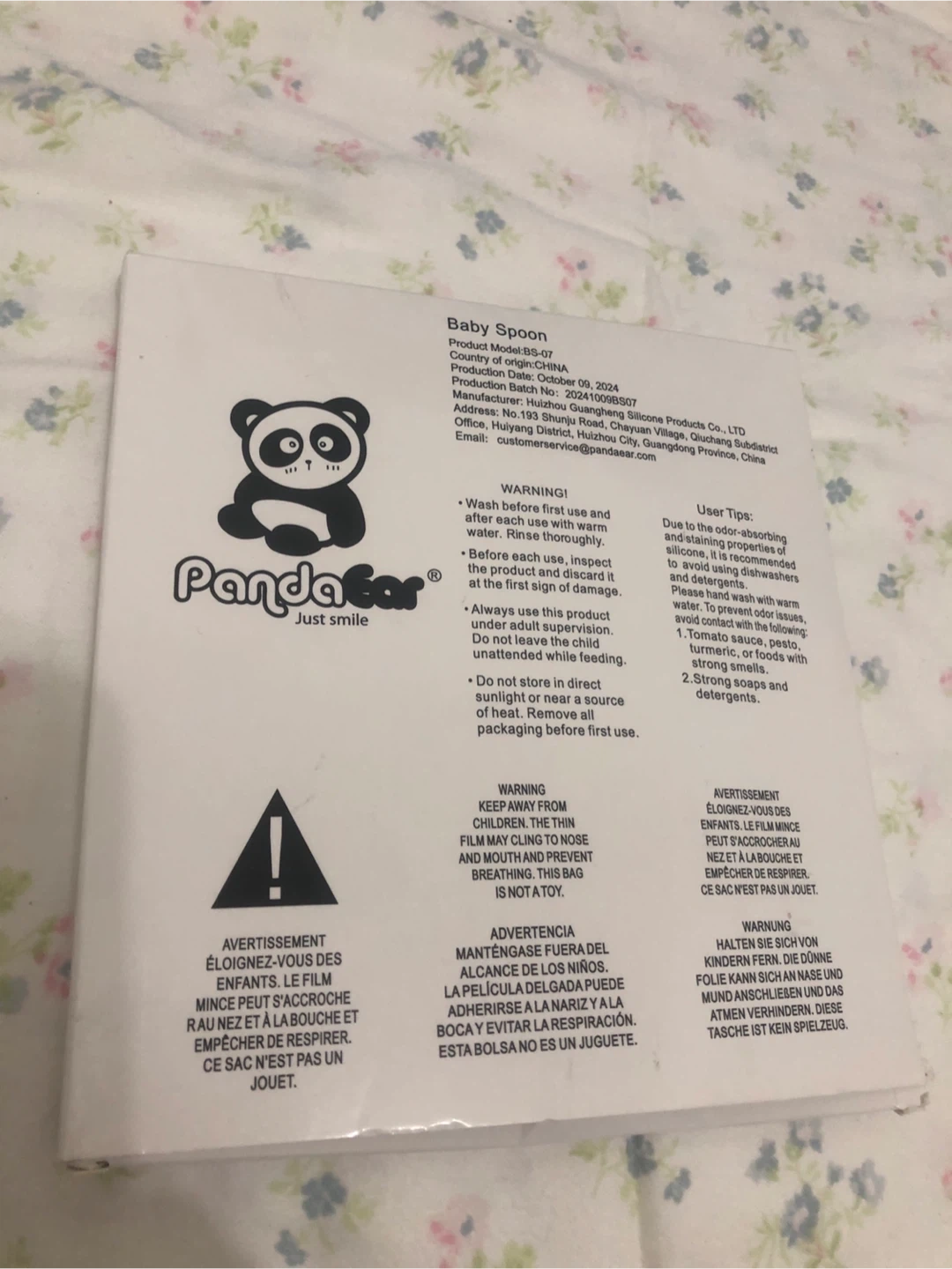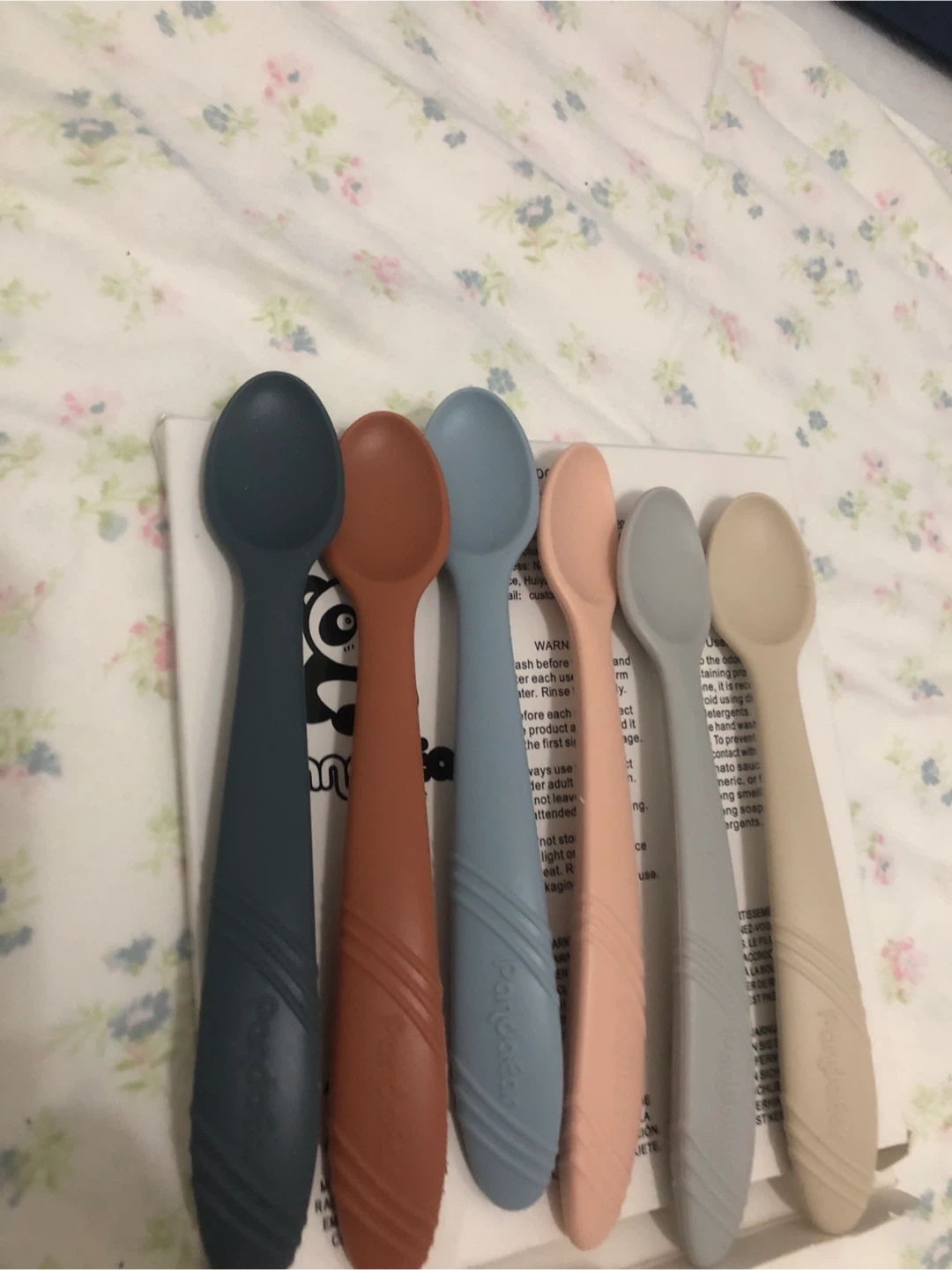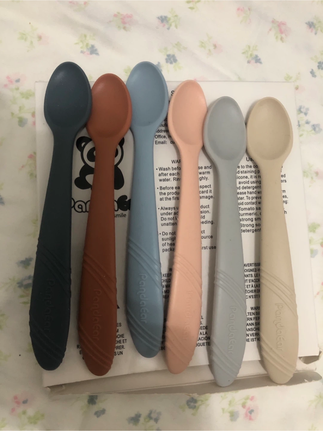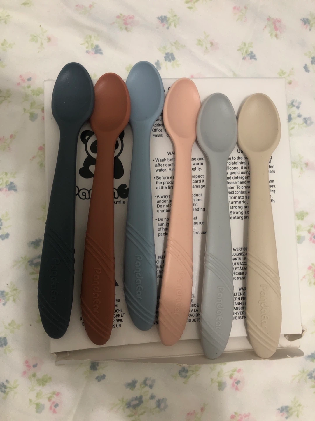 Here's a set of six PandaEar baby spoons! They come in a variety of soft, muted colours. The box is included, and it has all the original warnings and user tips. These spoons are designed for gentle feeding and are easy to hold. Perfect for starting solids!