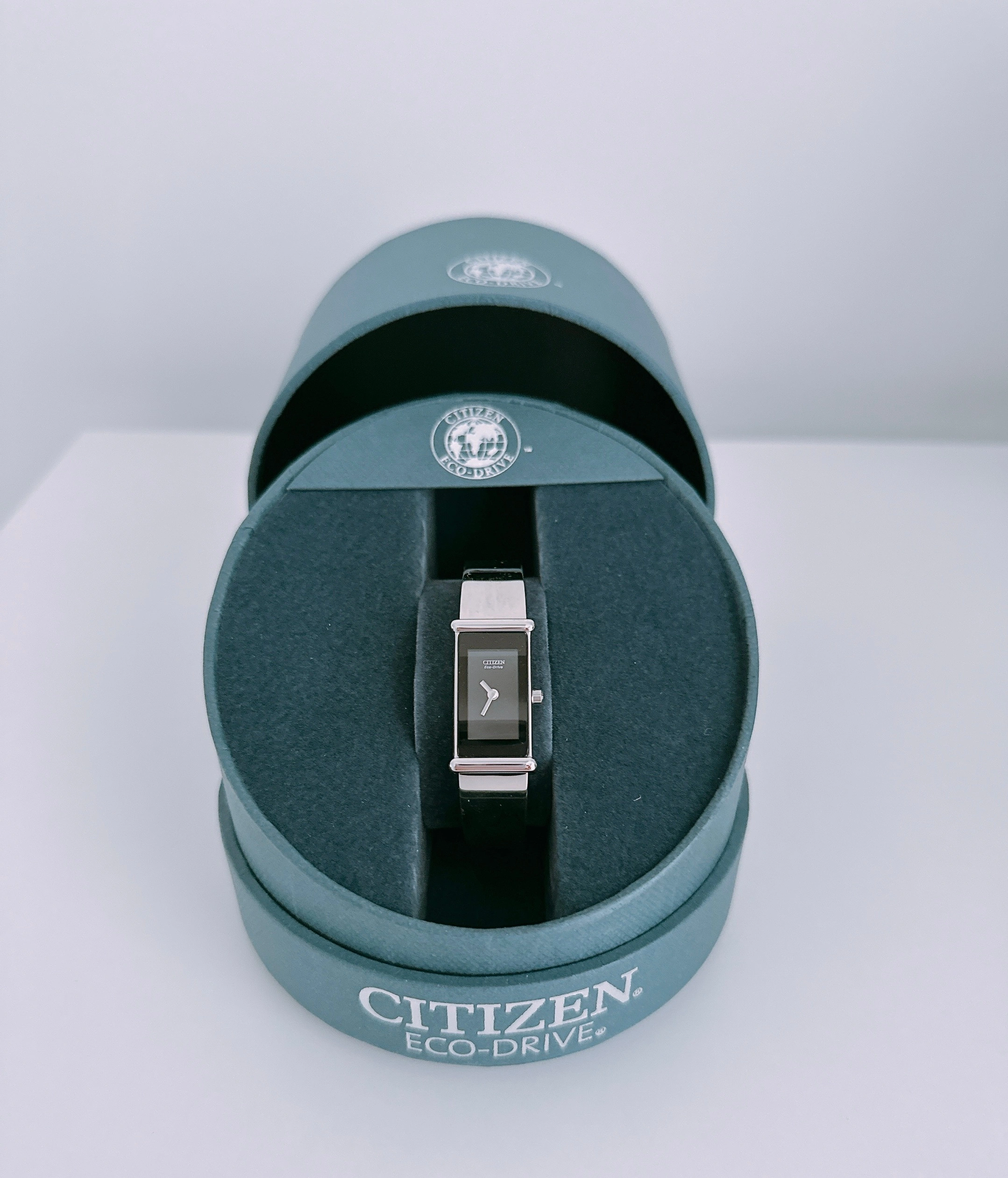 Elevate your everyday style with this stunning, minimalist Citizen timepiece. This watch features a modern rectangular black dial set in a polished stainless steel bangle-style bracelet. Because it's an Eco-Drive, it’s powered by any light source and never needs a battery! This is a timeless, low-maintenance piece perfect for the office or an evening out.