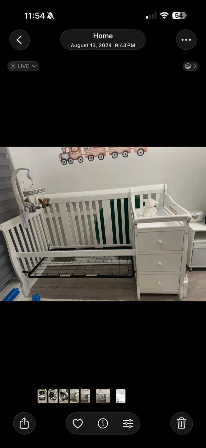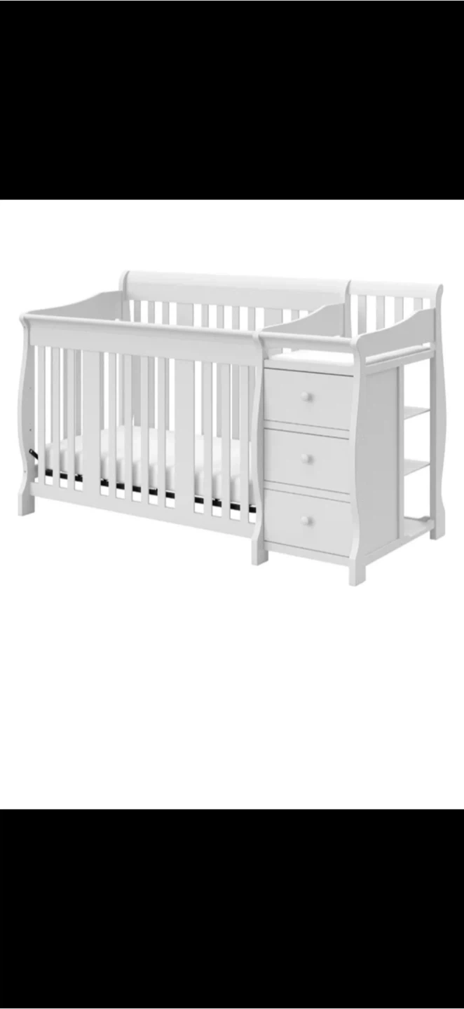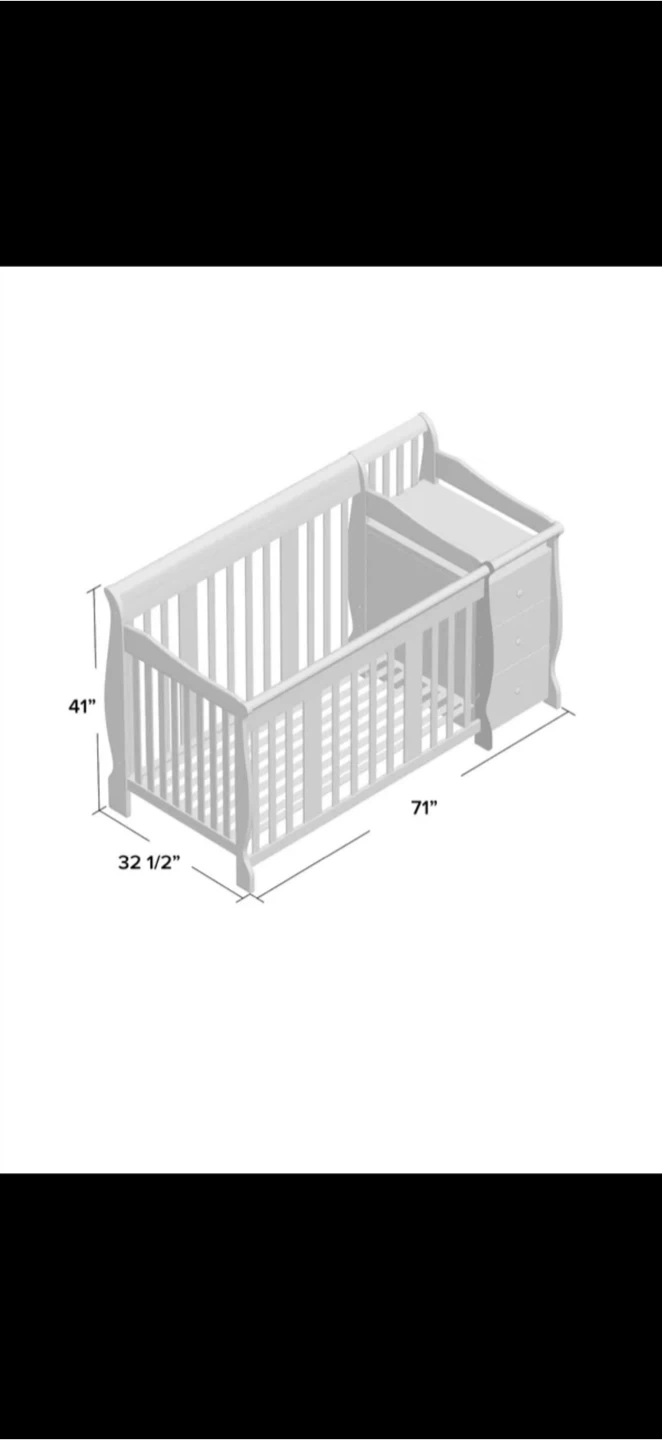 Selling a Storkcraft Portofino 5-in-1 Convertible Crib and Changer in white! This versatile crib converts to different bed sizes as your child grows. It also includes a convenient changing table with drawers and shelves for storage. Dimensions are 71" x 32.5" x 41"