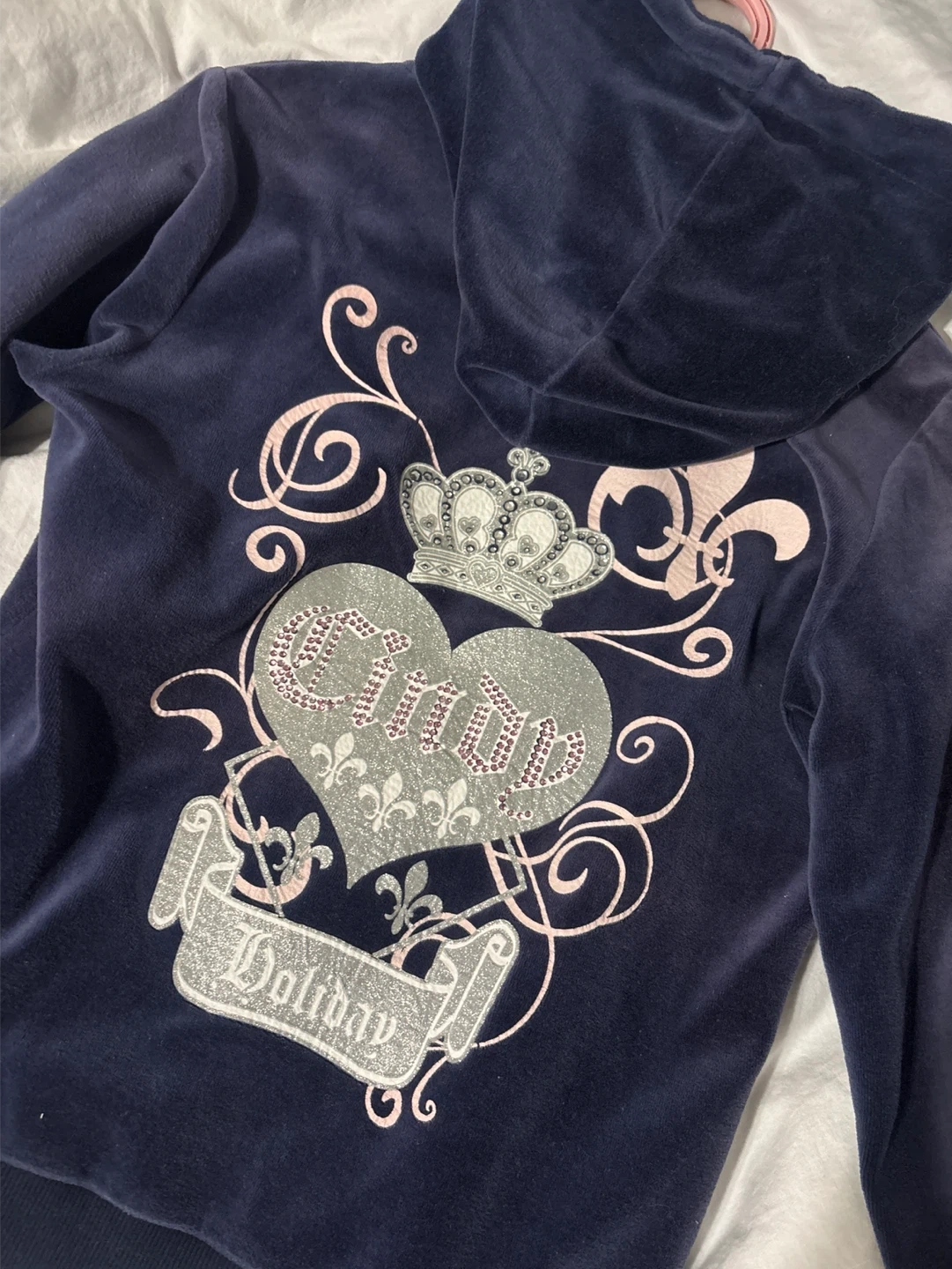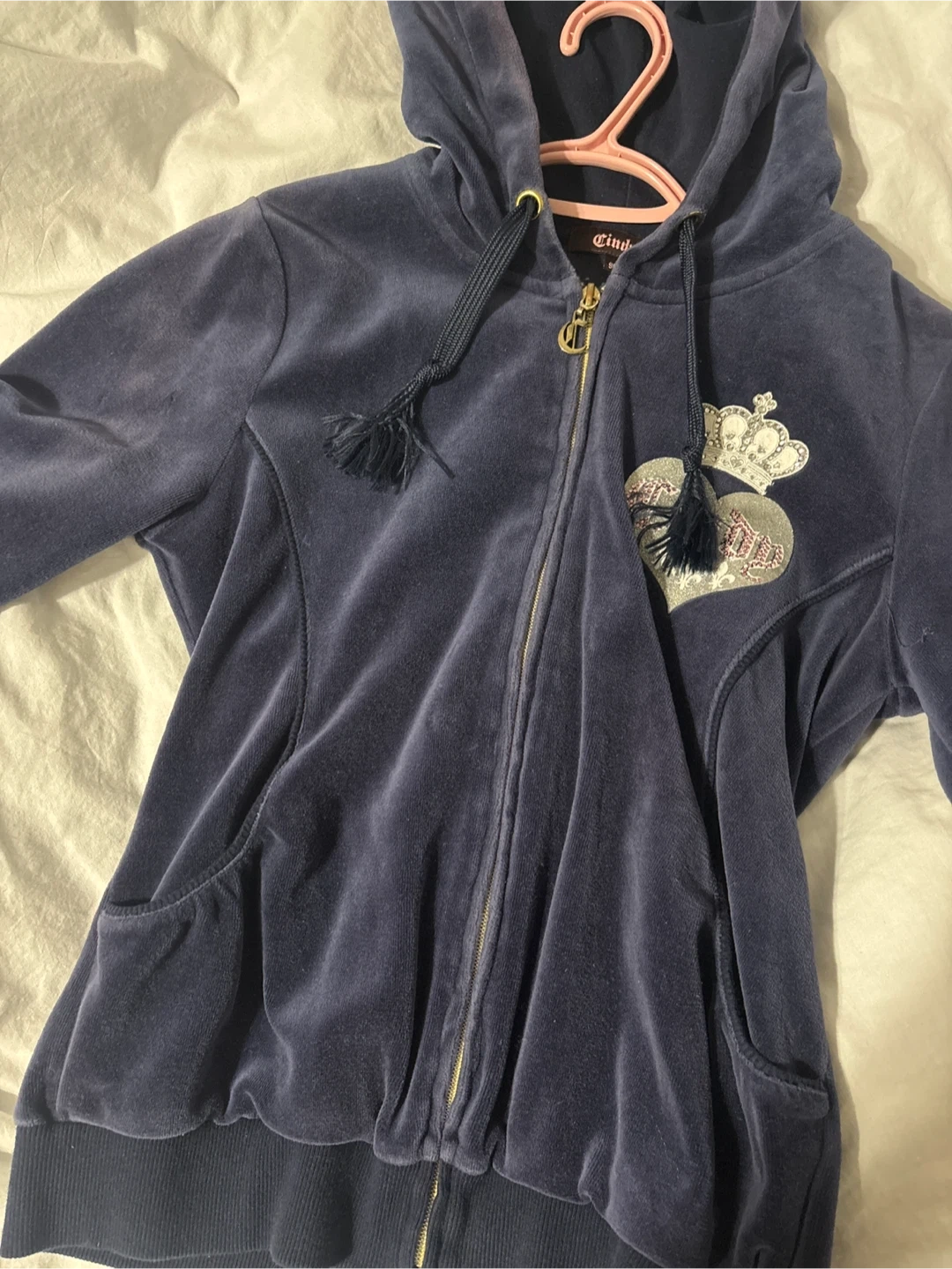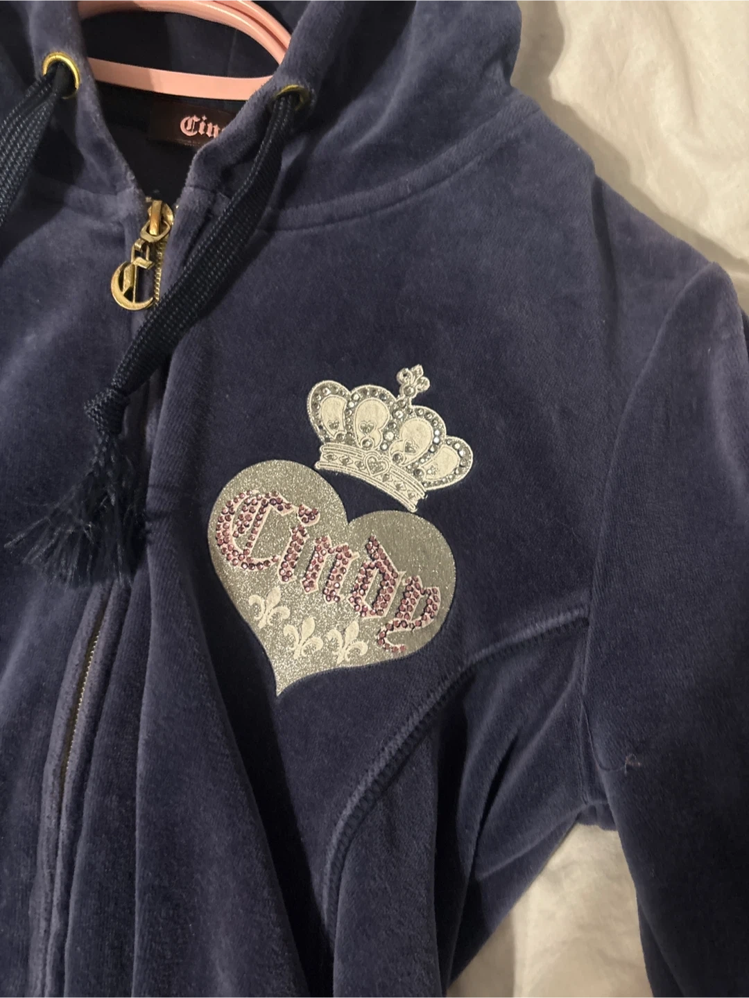 Selling a Cindy zip-up hoodie in a soft velour material. It's a size 90 and features a cute crown and heart design on the front and back. I’m selling this because it doesn’t fit me.