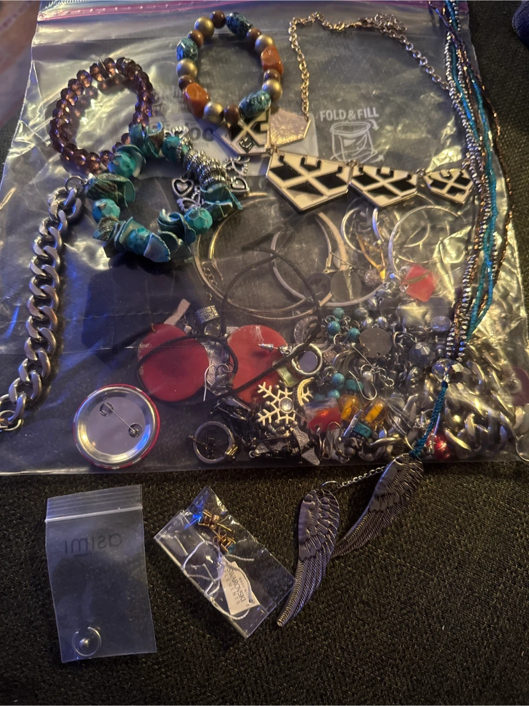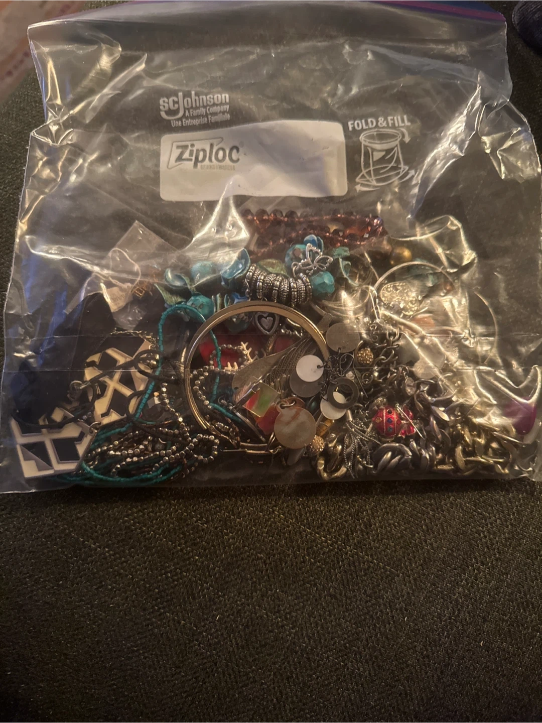 Selling a bag of assorted costume jewellery. There's a variety of necklaces, bracelets, earrings, and other pieces. Perfect for adding some sparkle to your outfits!