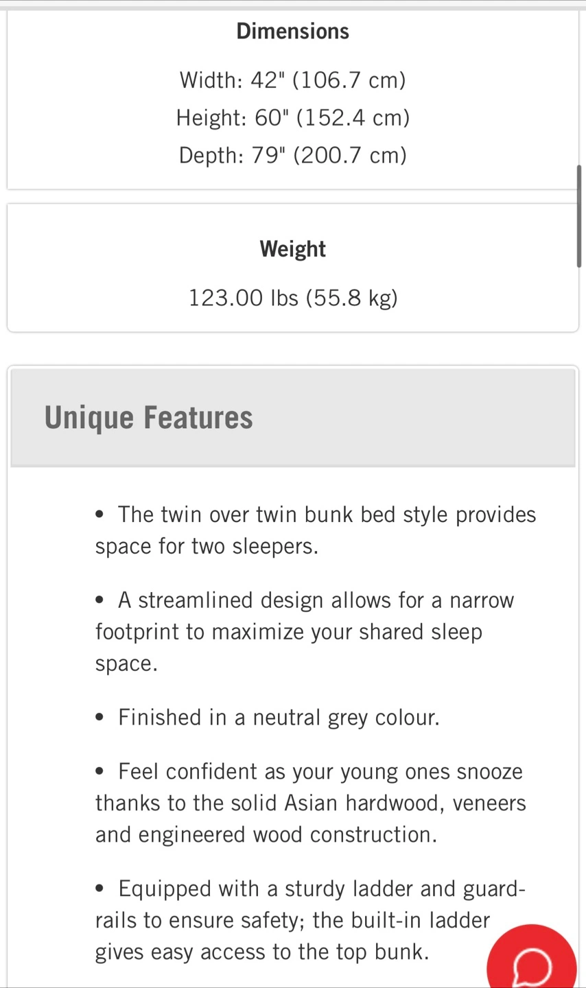 I am selling because it was big for my room. Never used. It is disassembled. The new one costs 1746$. Selling new never used twin bunk bed! The bunk bed is finished in a neutral grey colour and made with solid Asian hardwood, veneers, and engineered wood construction. It has a streamlined design to maximize your shared sleep space.