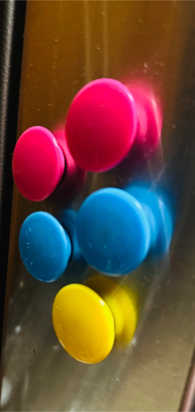 Selling a set of colorful round magnets! They come in pink, blue, and yellow. Perfect for adding a pop of color to your fridge or whiteboard