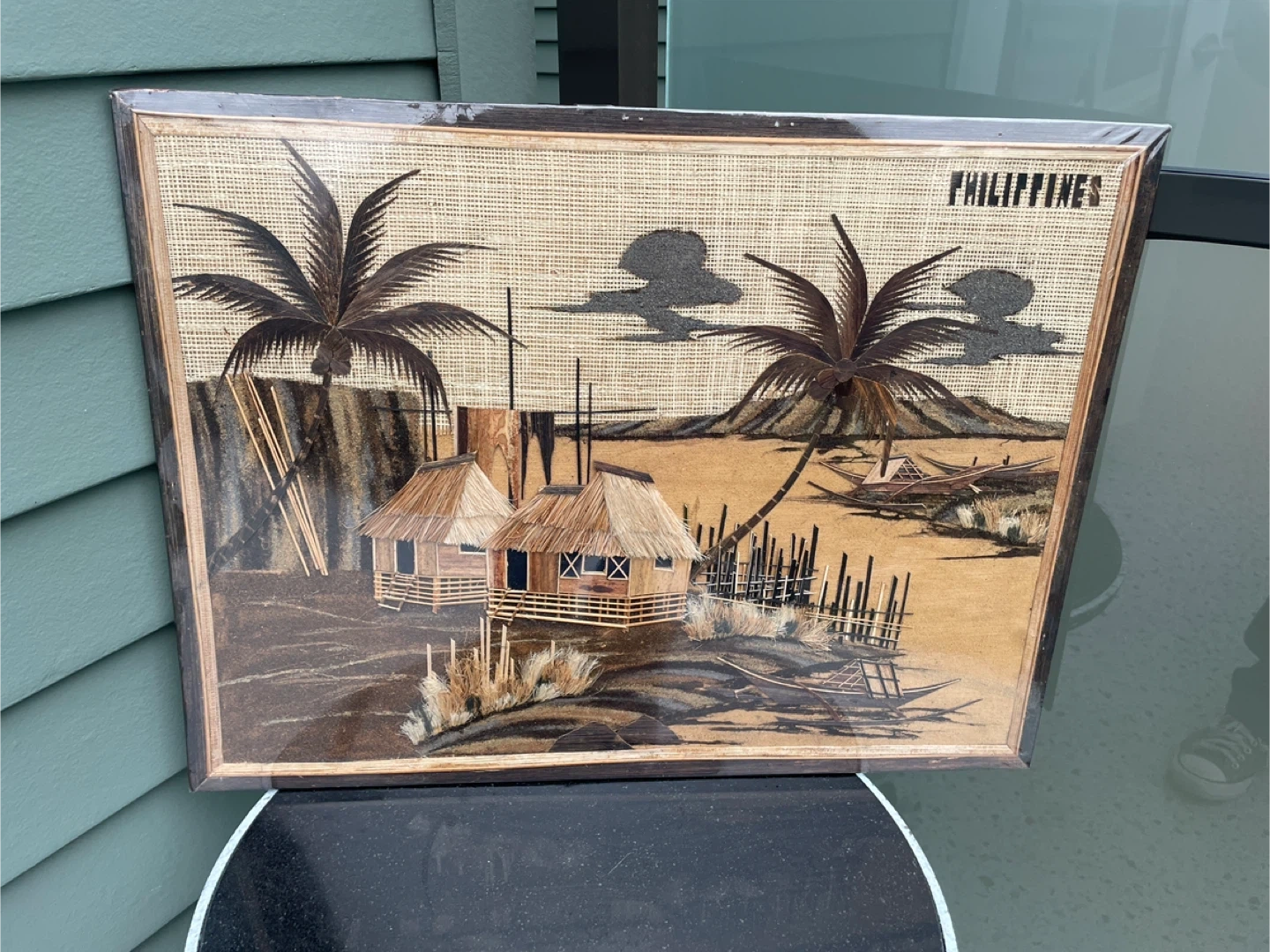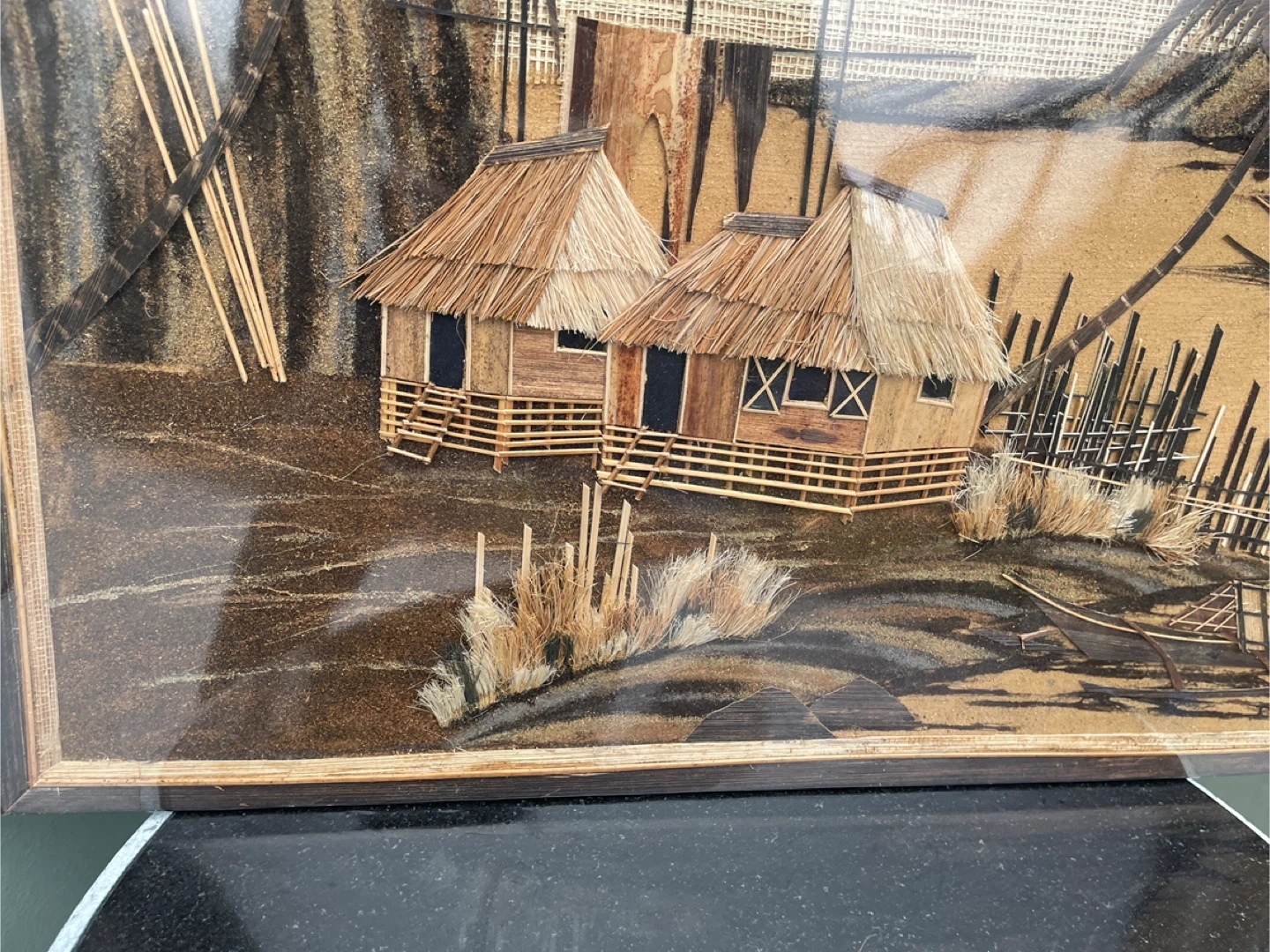 Beautiful handmade art from the Philippines, featuring houses and palm trees. It depicts typical rural life in the old days in the Philippines, houses made of NIPA HUT, paddle boats and fishnets made of dry bark. A unique piece for your home! 21” x 16”
