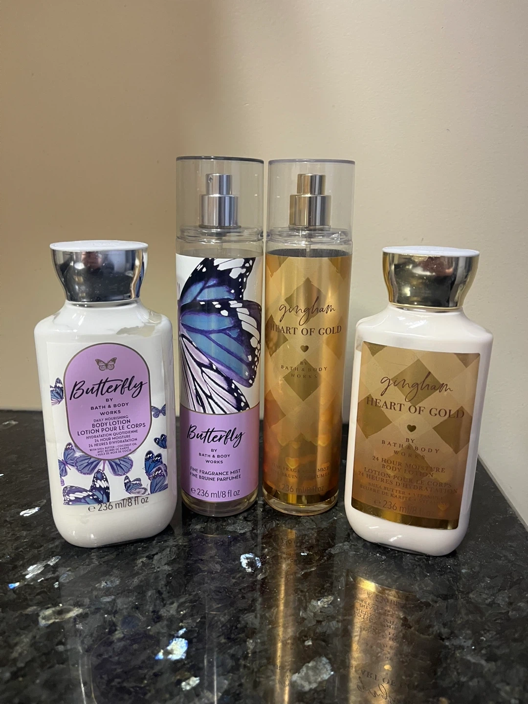 Selling a USED set of Bath & Body Works lotions and fine fragrance mists! Included are Butterfly Daily Nourishing Body Lotion, Butterfly Fine Fragrance Mist, Gingham Heart of Gold 24 Hour Moisture Body Lotion, and Gingham Heart of Gold Fine Fragrance Mist. 8 fl oz bottles but all used. Lotions are 2/3 full. Sprays only used a couple of times. Sold together
