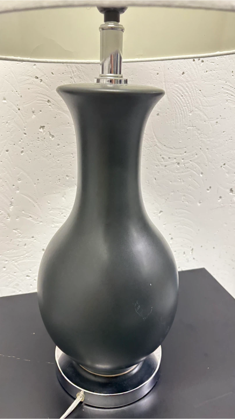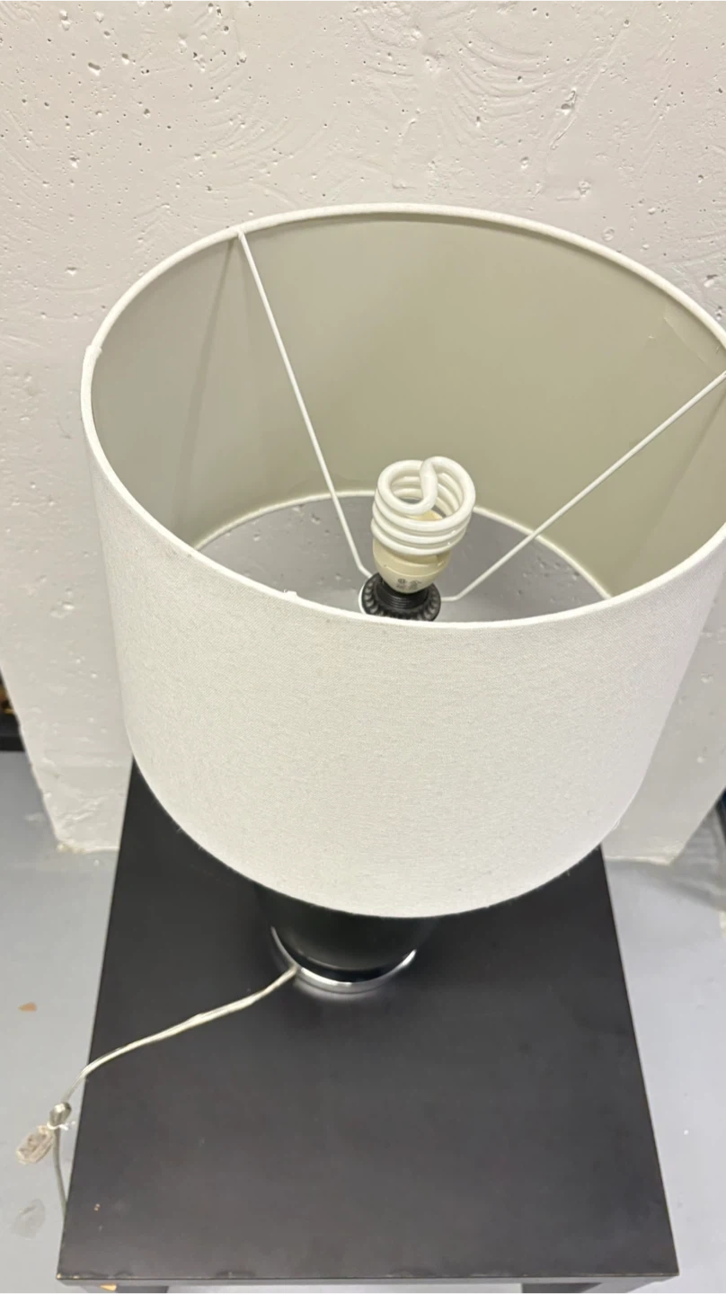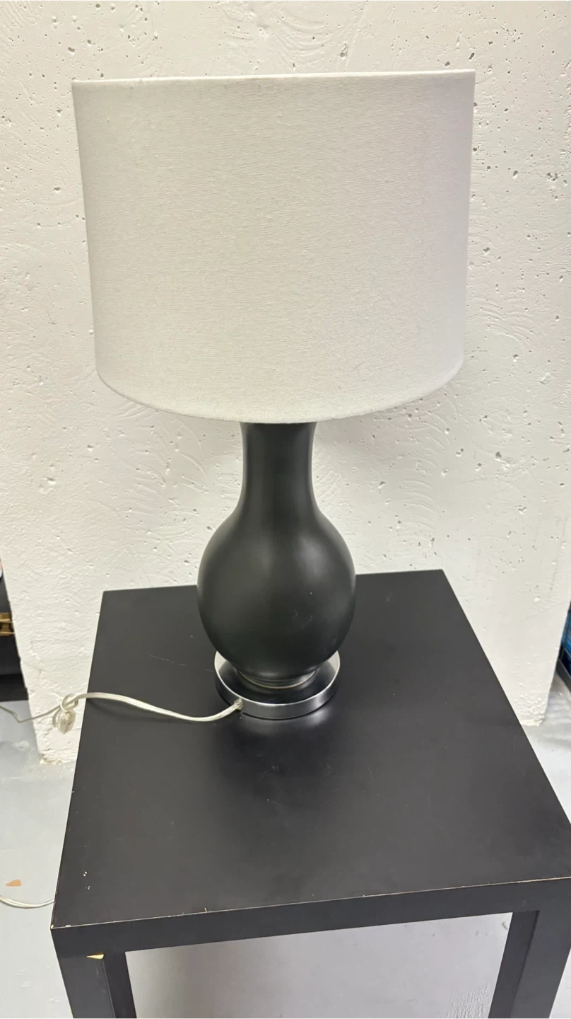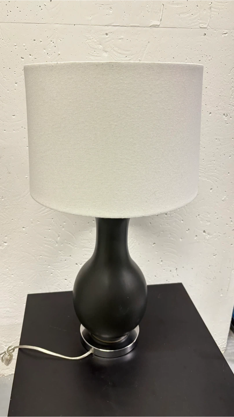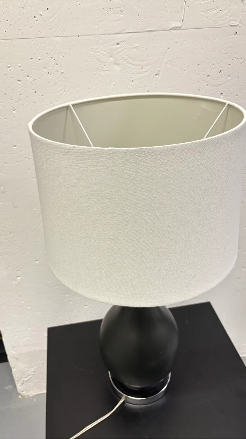 Selling a table lamp with a black base and a white shade. It's in great condition and would look lovely in any room! The lamp provides a nice, soft light. Perfect for a bedside table or desk
