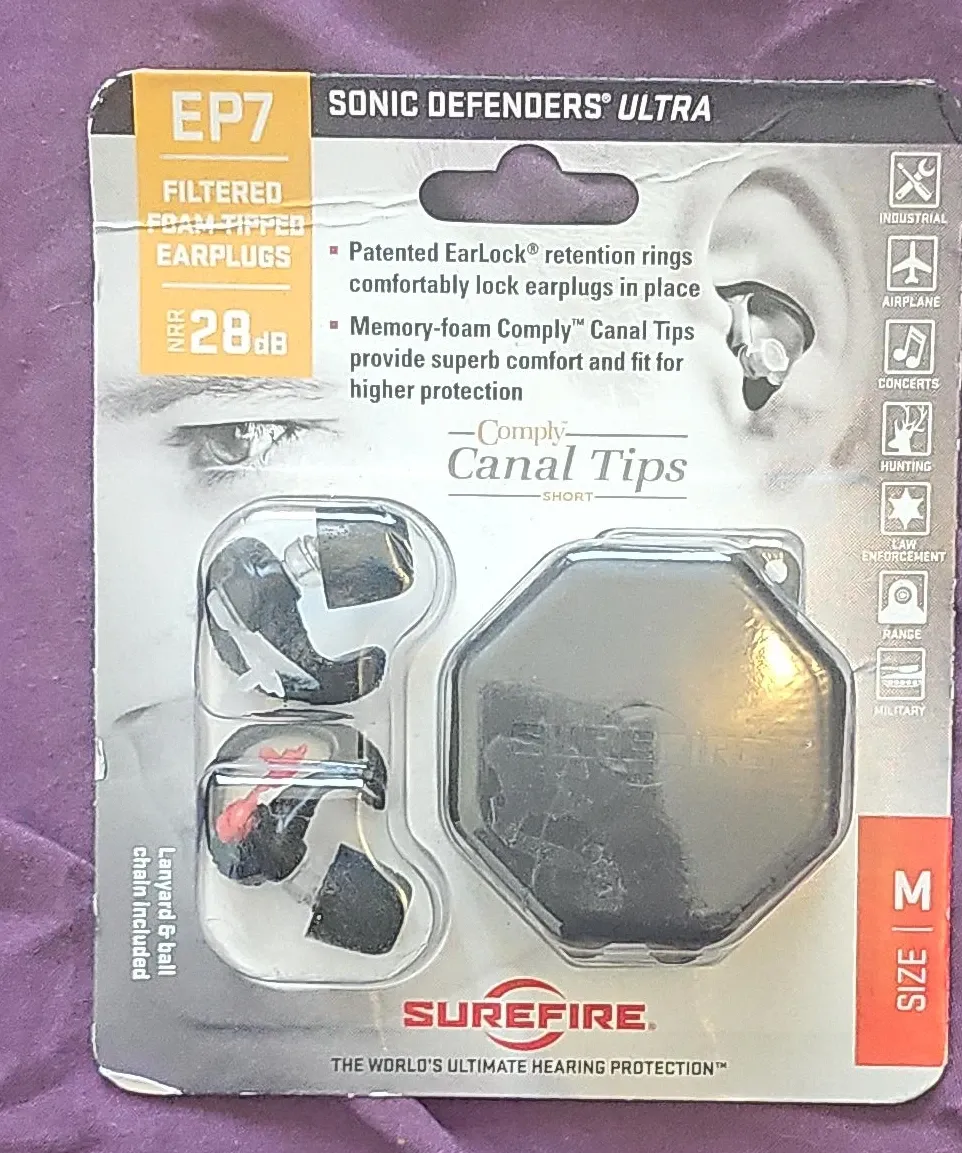 I'm selling a new set of Surefire EP7 Sonic Defenders Ultra earplugs in size medium! These filtered foam-tipped earplugs have a noise reduction rating of 28dB. They feature patented EarLock retention rings to comfortably lock the earplugs in place, and memory-foam Comply Canal Tips for superb comfort and fit. A lanyard and ball chain are included.