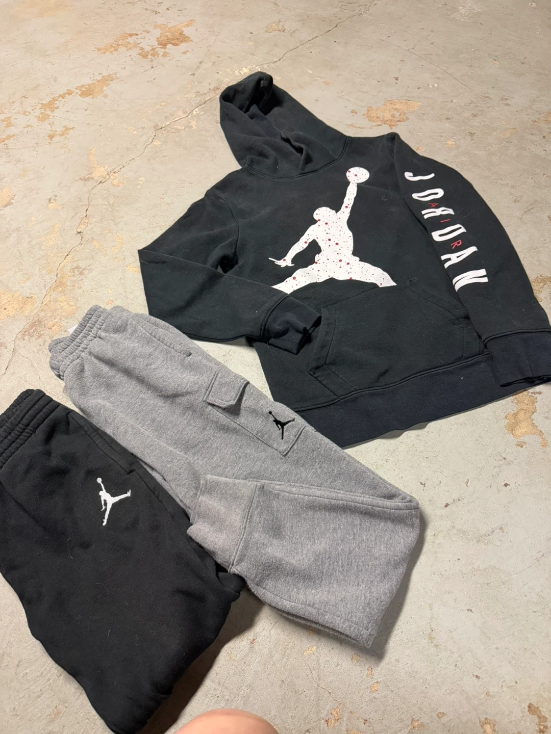 Selling a Jordan hoodie and two pairs of sweatpants. The hoodie is black with the iconic Jordan logo and the word 'Jordan' down the sleeve. One pair of sweatpants is black with the Jordan logo, and the other is grey with a cargo pocket and the Jordan logo. Great for casual wear or sports!