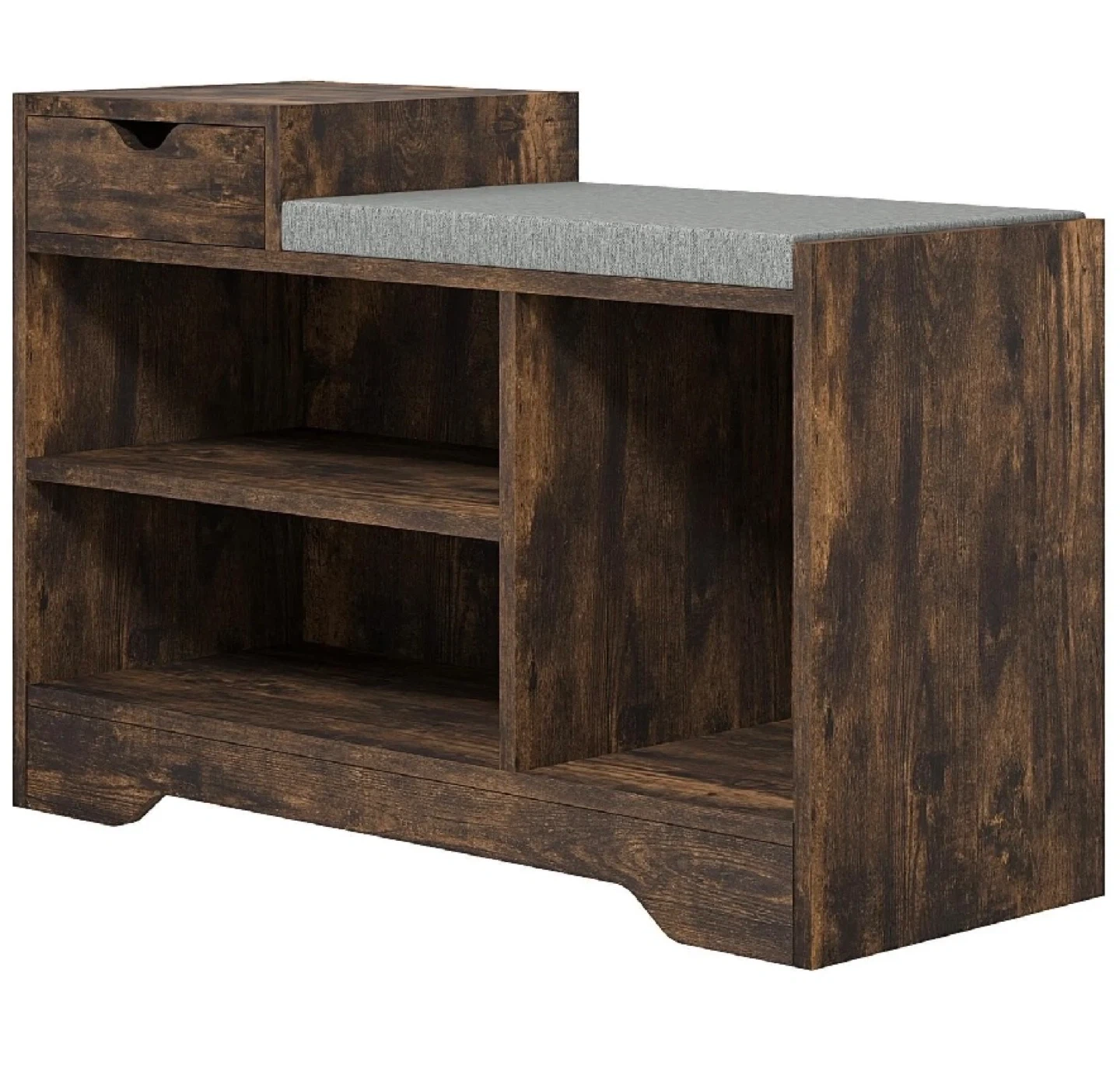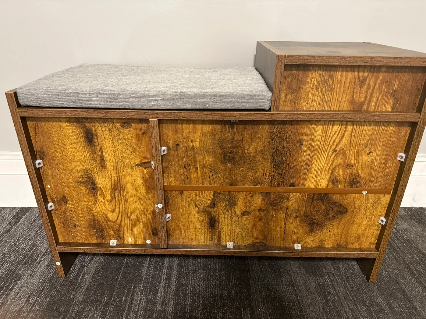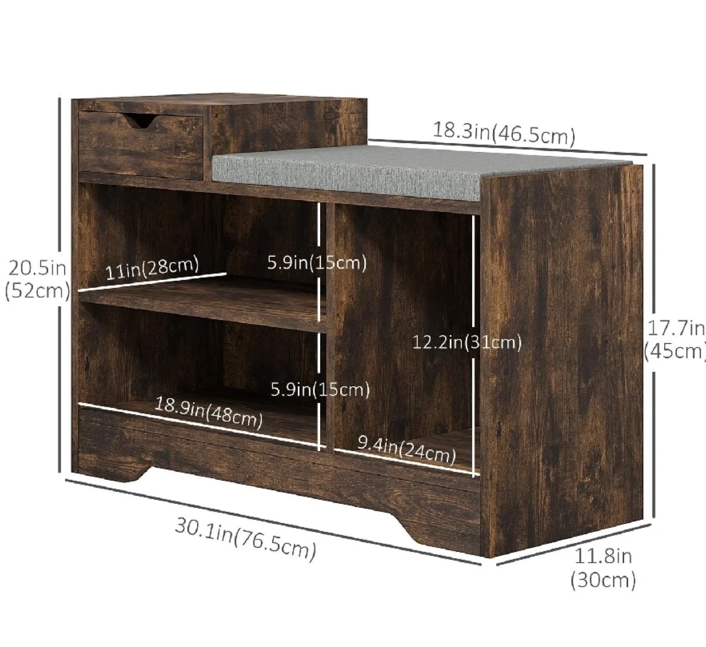 This rustic brown shoe storage bench is perfect for keeping your entryway organized! It comes pre-assembled and features a comfy grey cushion top, a drawer for small items, and two shelves for shoes. This item is in new condition, never been used! Add a touch of charm and functionality to your home with this lovely piece.